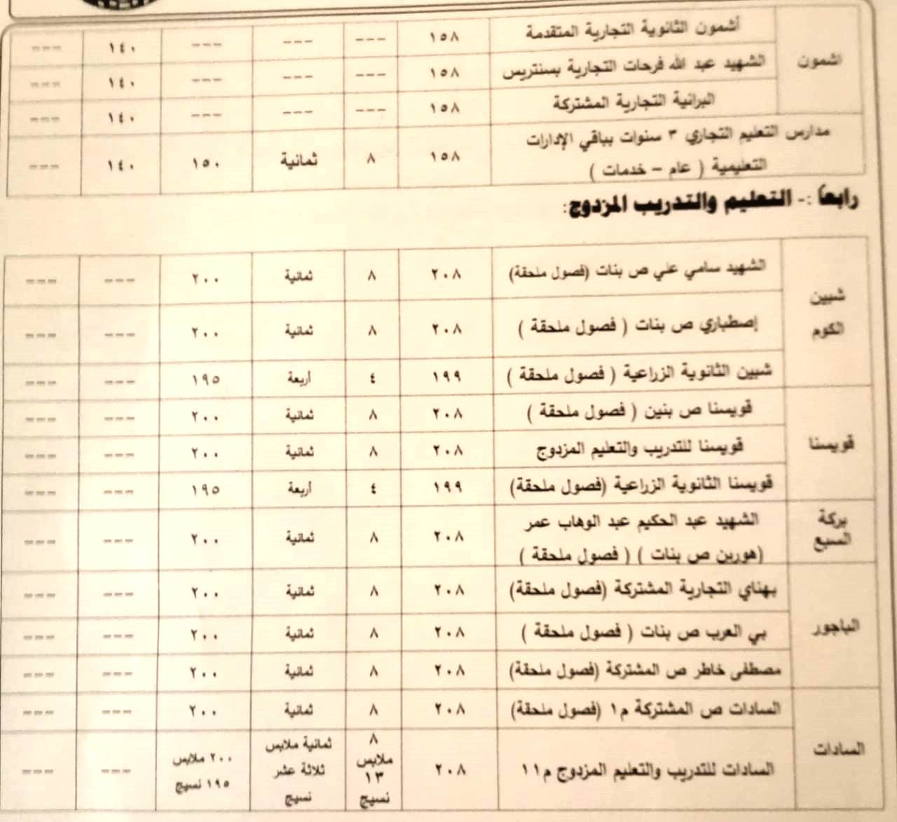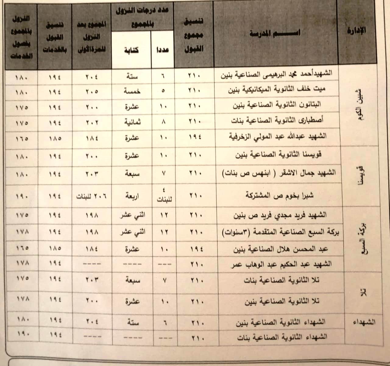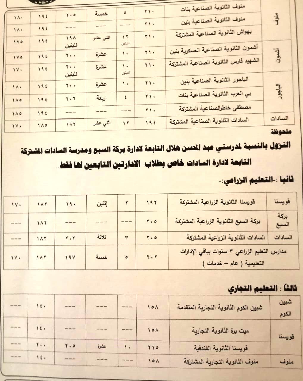 وافق اليوم اللواء إبراهيم أبو ليمون محافظ المنوفية على النزول بدرجات القبول في بعض المدارس الفنية للعام 2023 - 2024 ( عام _ خدمات ) بمختلف نوعياتها ( صناعى - زراعى - تجارى - التعليم والتدريب المزدوج ) ، وذلك لإستكمال الكثافات الطلابية بعدد من المدارس بكافة الإدارات التعليمية بنطاق المحافظة ووفقاً لأعداد المتقدمين ، جاء ذلك بناءً على المذكرة المقدمة من وكيل وزارة التربية والتعليم بالمنوفية بهدف إستكمال الكثافات الطلابية والإقبال المتزايد للالتحاق بالمدارس الثانوية الفنية وتخفيف العبء عن كاهل أولياء الأمور وحرصاً على المستقبل التعليمي لأبنائنا الطلاب.
