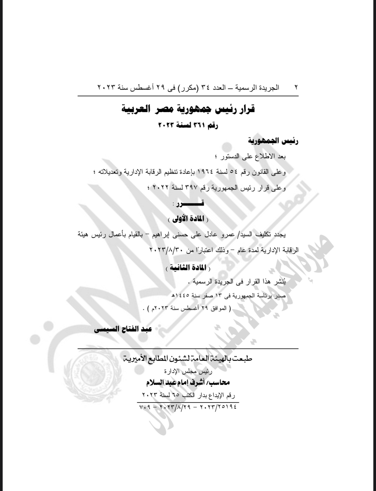 أصدر الرئيس عبدالفتاح السيسي، قرارا برقم 361 لسنة 2023 بتجديد تكليف عمرو عادل إبراهيم بالقيام بأعمال رئيس هيئة الرقابة الإدارية، لمدة عام؛ اعتبارا من 30 أغسطس 2023.