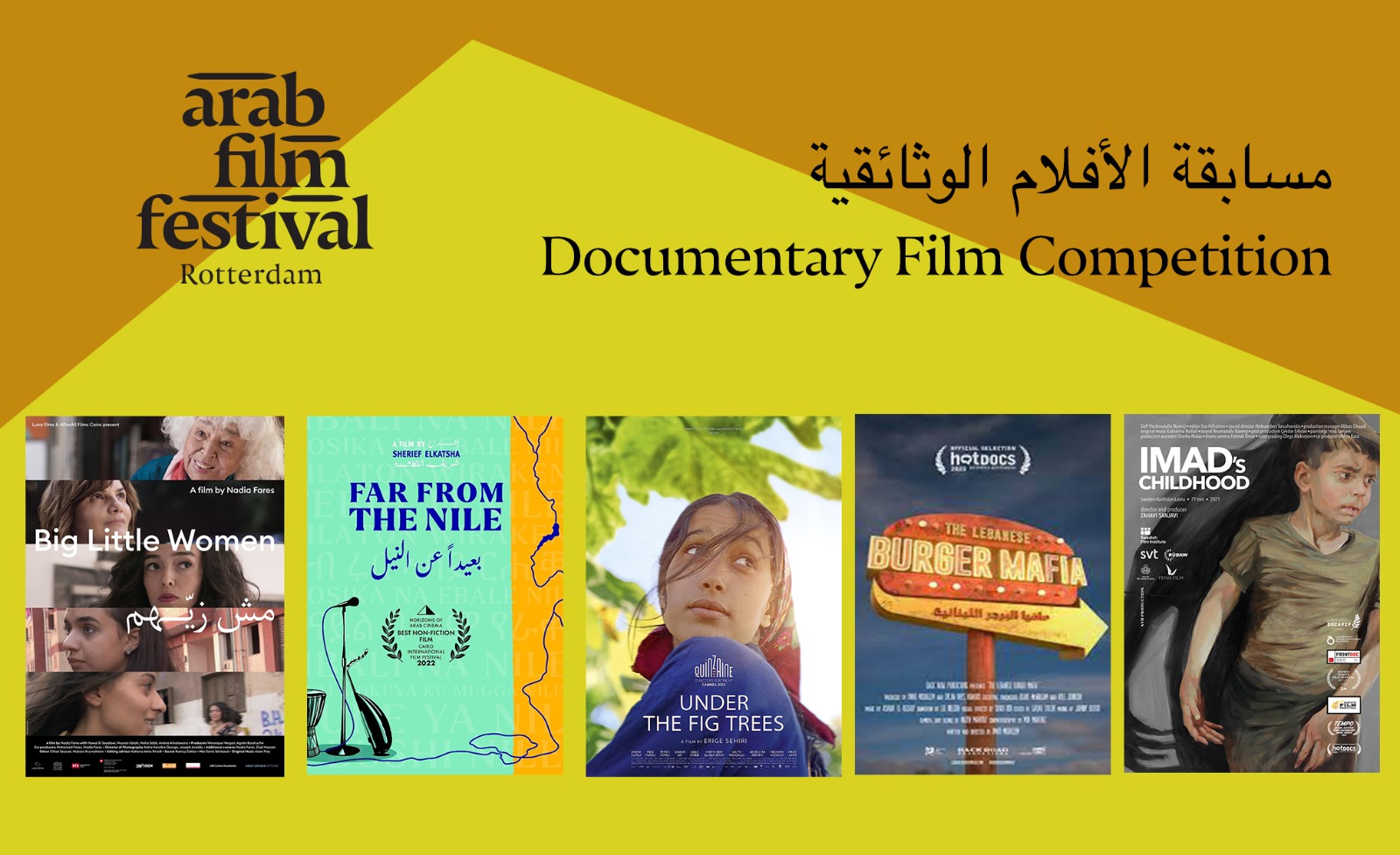 ويعرض بمسابقة الأفلام الوثائقية فيلم "تحت الشجرة" إخراج أريج السحيري (تونس، فرنسا، سويسرا، ألمانيا، قطر)، "مش زيهم" إخراج نادية فارس (مصر, سويسرا)، "بعيدًا عن النيل" إخراج شريف القشطة (مصر , الويلايات المتحدة الأمريكية)، "مافيا البرجر اللبنانية" إخراج عمر مواليم (كندا)، "طفولة عماد" إخراج زهافي سانجافي ( العراق، السويد ، ليتوانيا).