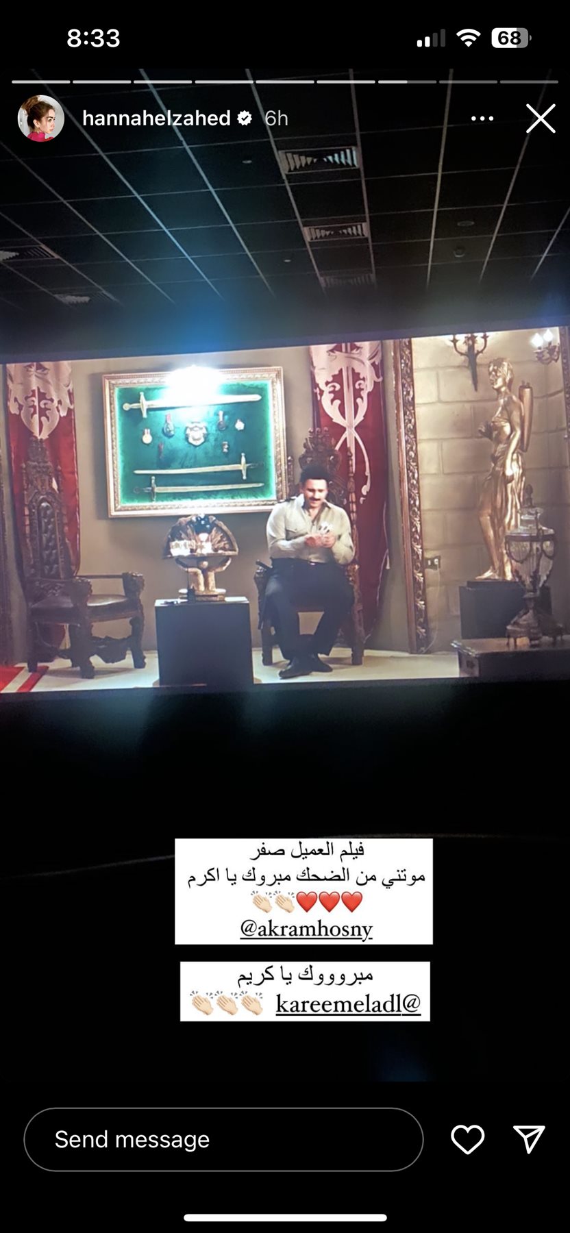 وكتبت لصناع الفيلم: “موتني من الضحك يا أكرم حسني، ومبروك كريم العدل”.