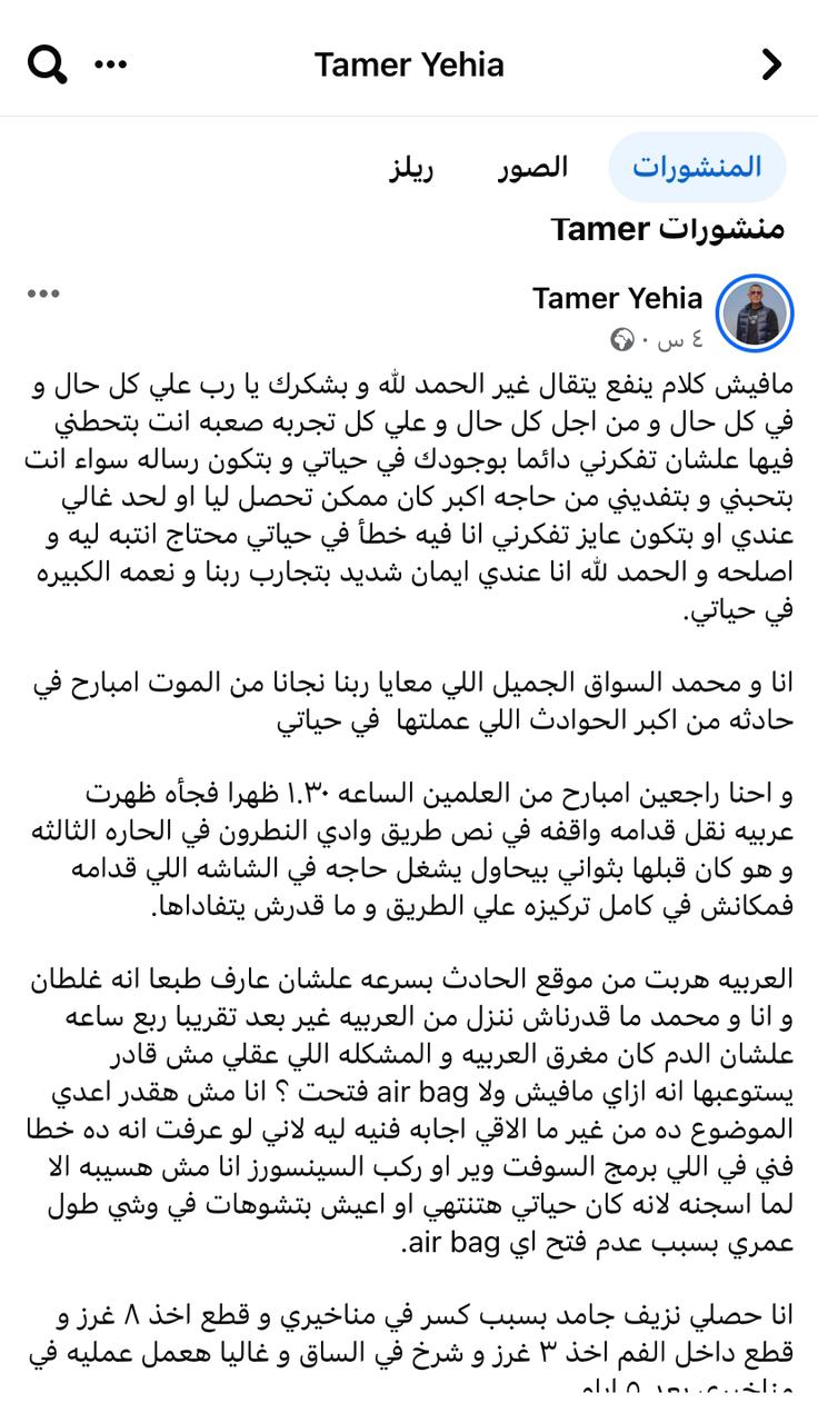 واختتم حديثه بـ، :" شكرا لكل اصحابي اللي وقفوا معايا و ساعدوني و اهتموا انهم ينقلوني افضل مستشفييات علشان اخد احسن رعايه و غرز تجميل و اتطمن على نفسي ، شكرا هاني هانز و ضياء سليمان و دكتور محمود السيد و دكتور احمد نجم و كل تيم مستشفي الرفيده علي كل حاجه ، شكرا اخواتي تامر حسني و حسام حسني و رومير علي الاهتمام و متابعه حالتي طول اليوم ،شكرا عماد نبيل بجد انت اخ حقيقي علي كل اللي عملته معايا النهارده و خلي بالك من العربيه بقي لحد ما تروح لحال سبيلها او نبيعها خرده علشان انا مش هركبها تاني و ربنا يعوض عليا و يبعد عننا كلنا العين الشريره ، تاني انا كويس الحمد لله بس معلش انا تليفوني قافله كام يوم محتاج فيهم راحه و هدوء".