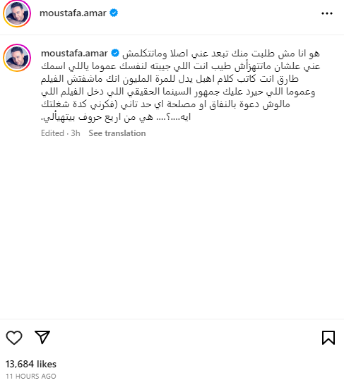 وقال مصطفي قمر : هو انا مش طلبت منك تبعد عني اصلا وماتتكلمش عني علشان ماتتهزأش طيب انت اللي جيبته لنفسك عموما ياللي اسمك طارق انت كاتب كلام اهبل يدل للمرة المليون انك ماشفتش الفيلم وعموما اللي حيرد عليك جمهور السينما الحقيقي اللي دخل الفيلم اللي مالوش دعوة بالنفاق او مصلحة اي حد تاني (فكرني كدة شغلتك ايه….؟…. هي من اريع حروف بيتهيألي