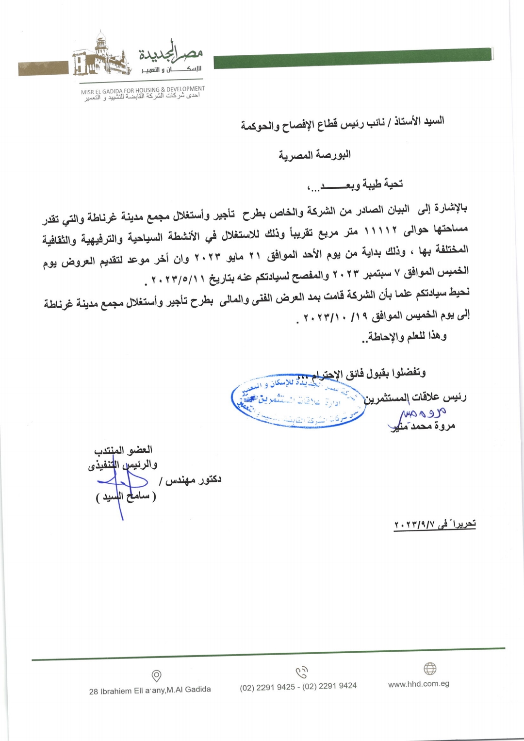 كشفت شركة مصر الجديدة للإسكان والتعمير، التابعة للقابضة للتشييد والتعمير احدى شركات وزارة قطاع الأعمال العام، عن مد العرض الفني والمالي بطرح تأجير واستغلال مجمع مدينة غرناطة إلى يوم الخميس الموافق 19 أكتوبر 2023، وفقا لبيان الشركة اليوم.