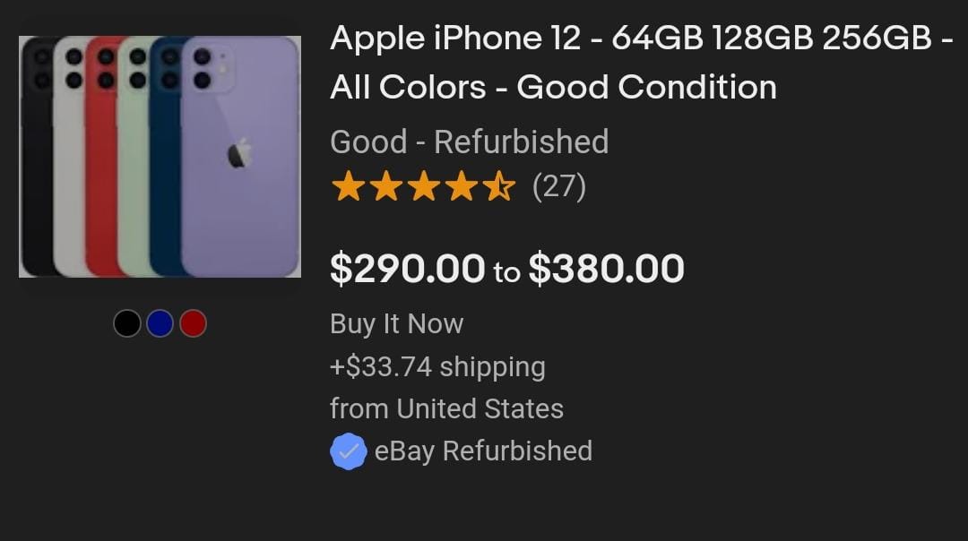 فشاهدنا عرضا رائعا على موقع eBay الأمريكي يبيع هاتف آيفون iPhone 12 ليصل سعره بعد الخصم إلى 290 دولار أمريكي (أي ما يعادل 9000 جنيه مصري ).