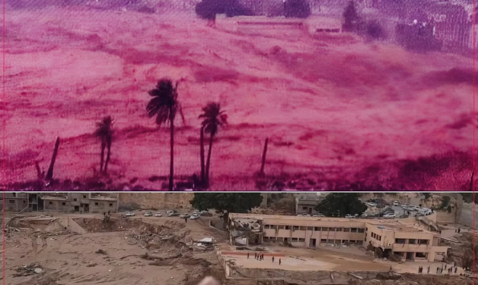 نشرت صحيفة المرصد الليبية أول صورة للحظة هجمة الطوفان على درنة ليلة انهيار السد حيث توضح حجم المياه التي ضربت المدينة بالمقارنة مع صورة لنفس المكان بعد الكارثة.