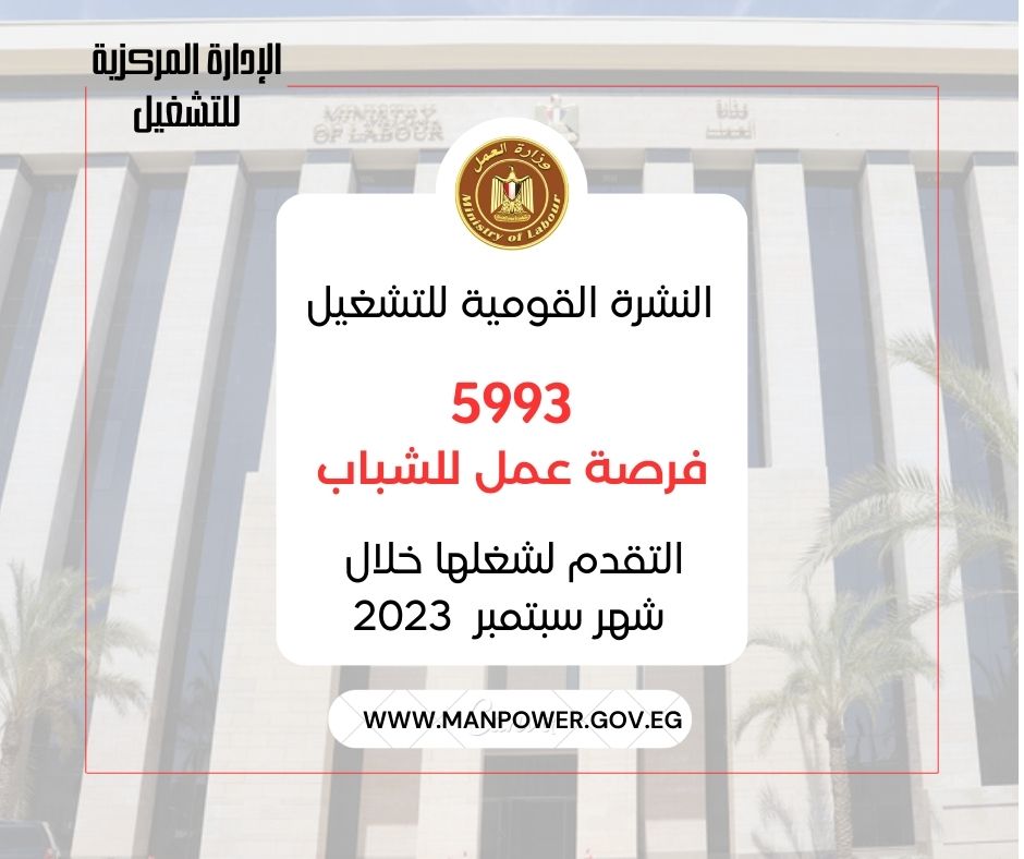 وفرت وزارة العمل 5993 فرصة عمل علي مستوي 17 محافظة من 77 شركة في عدد من التخصصات، منها لذوى القدرات الخاصة ، برواتب تبدأ من 3000 جنيه شهرياً ، فضلا عن التأمين الصحي والاجتماعي، وذلك للتقديم عليها خلال شهر سبتمبر 2023 الجاري .