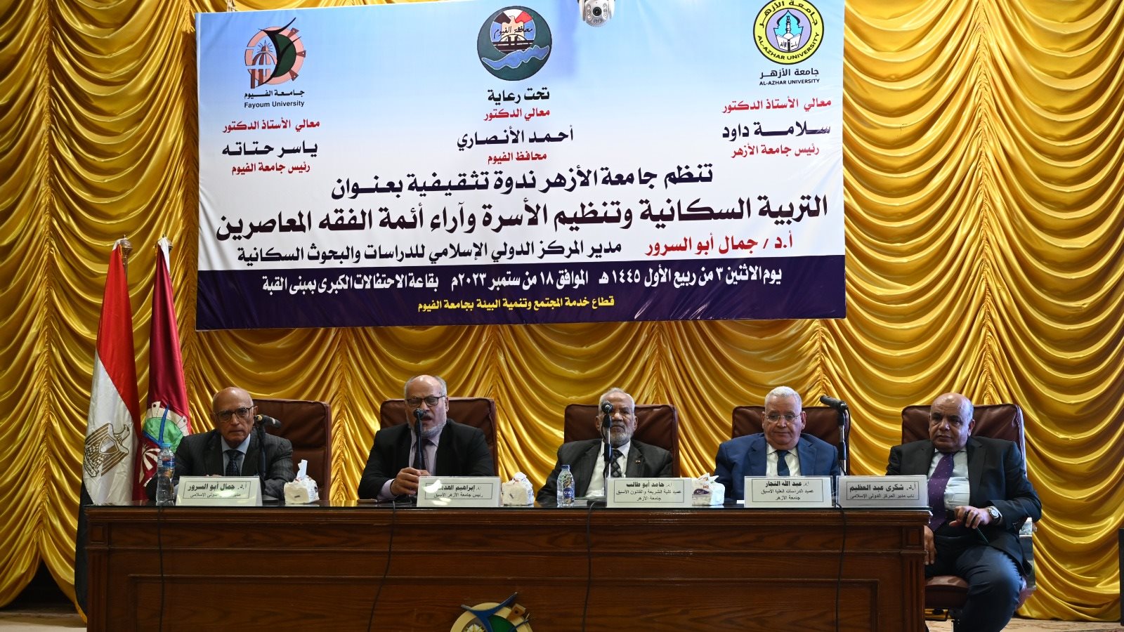جاء ذلك بحضور الدكتور محمد فاروق الخبيري نائب رئيس الجامعة لشئون التعليم والطلاب، و الدكتور عرفة صبري حسن نائب رئيس الجامعة لشئون الدراسات العليا والبحوث، و الدكتور عاصم فؤاد العيسوي نائب رئيس الجامعة لشئون خدمة المجتمع وتنمية البيئة، و الدكتور أحمد جابر شديد رئيس جامعة الفيوم السابق، والسادة عمداء الكليات والأستاذ الدكتور نور الرمادي رئيس مجلس إدارة نادي أعضاء هيئة التدريس، والأستاذ أشرف الغندقلي القائم بأعمال أمين عام الجامعة، والأستاذ عمرو ماضي أمين الجامعة المساعد للشئون المالية ورئيس مجلس إدارة اللجنة الرياضية، والأستاذة هالة السويفي مدير عام العلاقات العامة والإعلام، والأستاذ عبد الناصر بكري رئيس اللجنة النقابية للعاملين بالجامعة، وذلك اليوم الخميس الموافق ٢٠٢٣/٩/٢١ بقاعة الاحتفالات الكبرى بمبنى القبة.