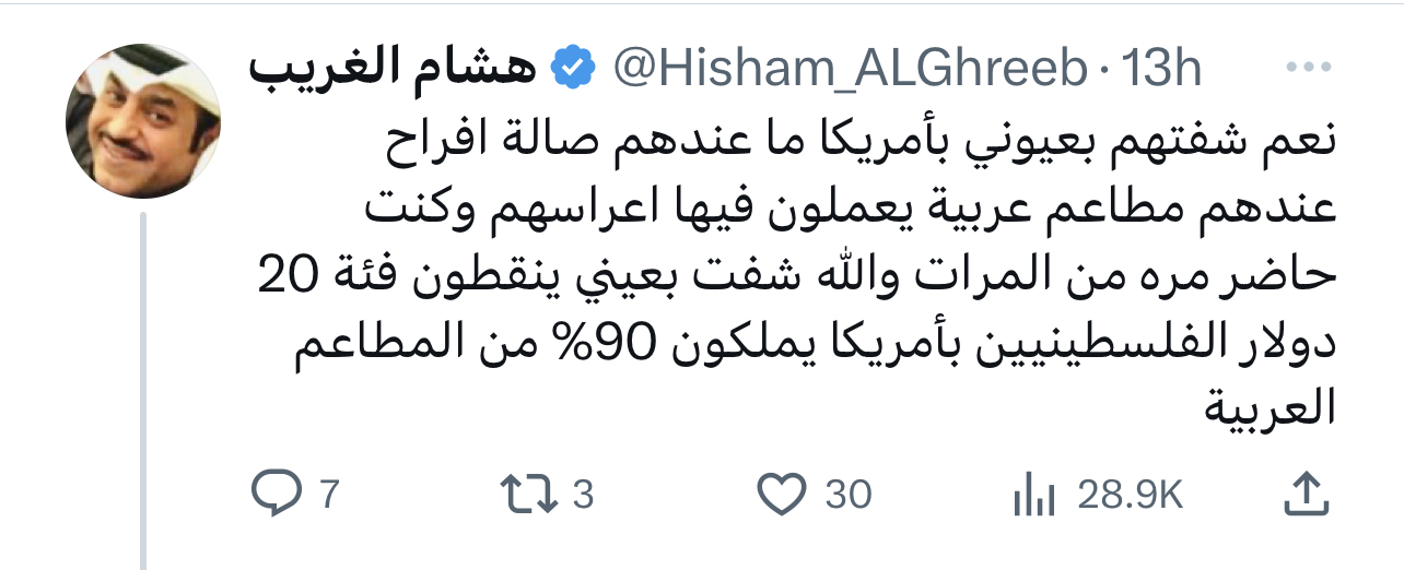 وتابع: "كنت حاضر مرة من المرات والله شفت بعيني ينقطون فئة 20 دولار، الفلسطينيين بأمريكا يملكون 90% من المطاعم العربية".