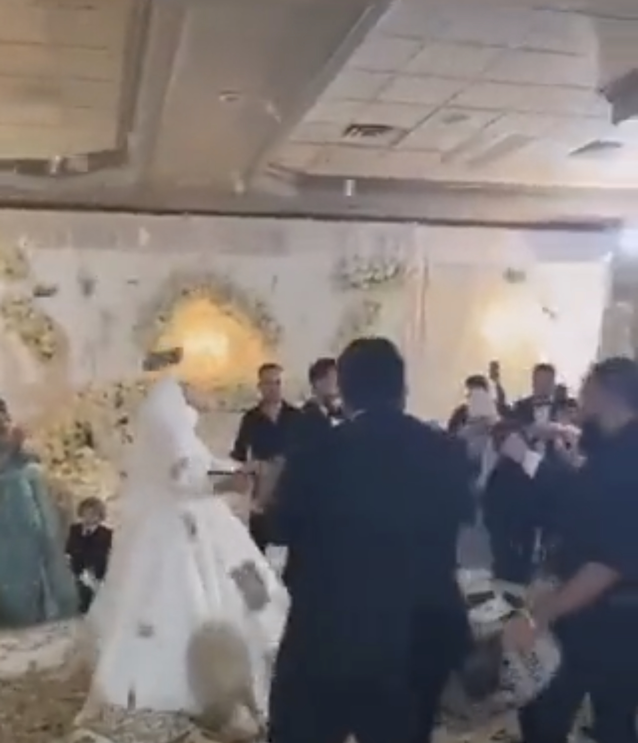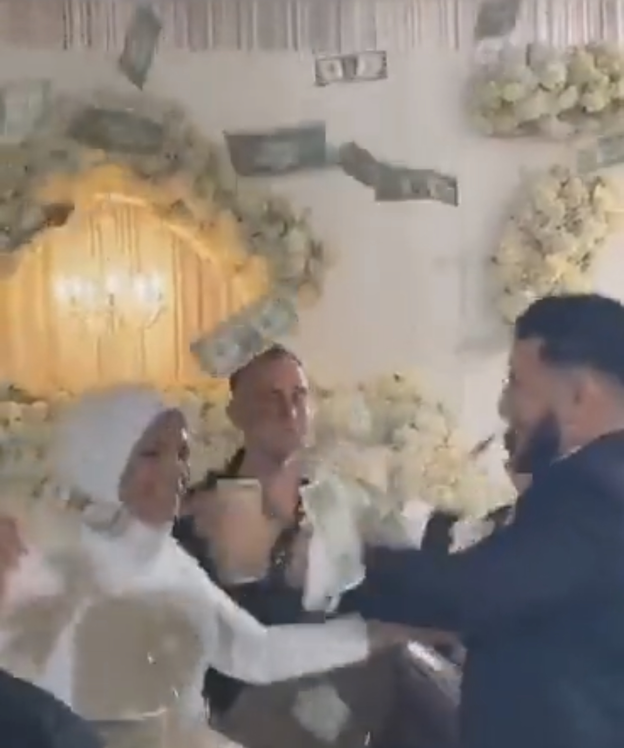 واستمر العريس وعروسه في الرقص علي موسيقي زفة حفل الزفاف، أثناء إلقاء أحد أقارب العريس الأموال بالدولار عليهما وهما يرقصان، فوق الفلوس التي ألقيت علي الأرض.