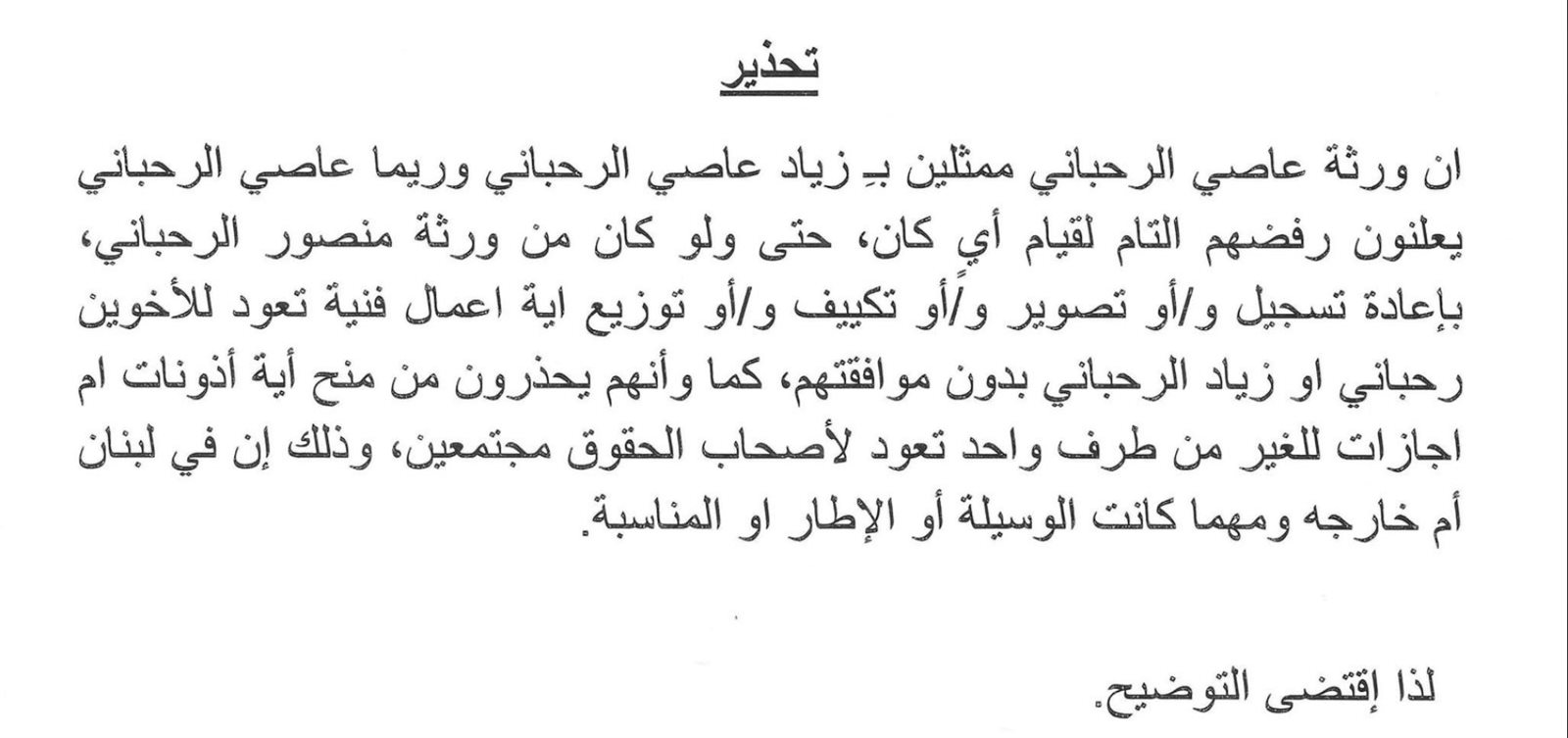 وقالت ريما الرحباني في البيان عبر فيسبوك :إنَّ ورثة عاصي الرحباني مُمثَّلين بِزياد عاصي الرحباني وريما عاصي الرحباني يُعلنون رَفضَهم التام لقيام أيٍّ كان، حتَّى ولو كان من ورثة منصور الرحباني، بإعادة تسجيل و/أو تصوير و/أو تكييف و/أو توزيع أيّة أعمال فنّية تعود للأخوين رحباني أو زياد رحباني بدون موافقتهم.