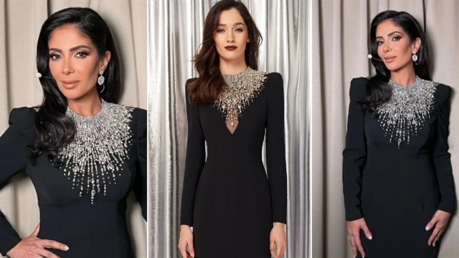 وظهرتسيرين عبد النور،ترتدي جمبسوت باللون الأبيض، بتصميم الأوف شولدرز، وبأكمام طويلة، ويتوسطه حزام بنفس اللون، واختارت حذاء باللون الفضي.