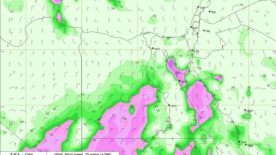 وبالنسبة لحالة البحر الأحمر تكون معتدلة وارتفاع الموج من 1.5 متر إلى 2.25 متر والرياح السطحية شمالية غربية.