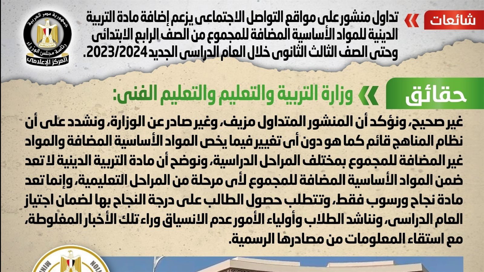 نفي المركز الاعلامي بمجلس الوزراء ، ما تداولت بعض المواقع الإلكترونية وصفحات التواصل الاجتماعي منشوراً ، يزعم إضافة مادة التربية الدينية للمواد الأساسية المضافة للمجموع من الصف الرابع الابتدائي وحتى الصف الثالث الثانوي، خلال العام الدراسي الجديد 2023/2024.