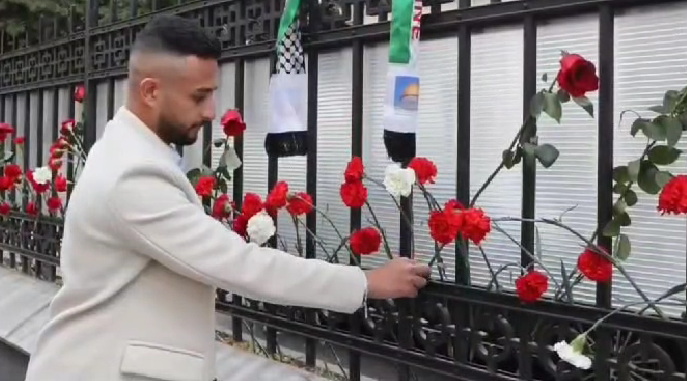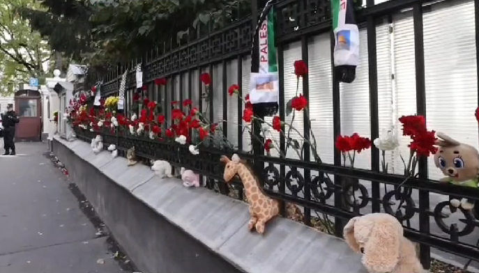قالت السفارة الروسية لدى مصر، اليوم الجمعة، إن المواطنين الروس في روسيا، يضعون الزهور وباقات الورود والألعاب أمام سفارة فلسطين في موسكو.