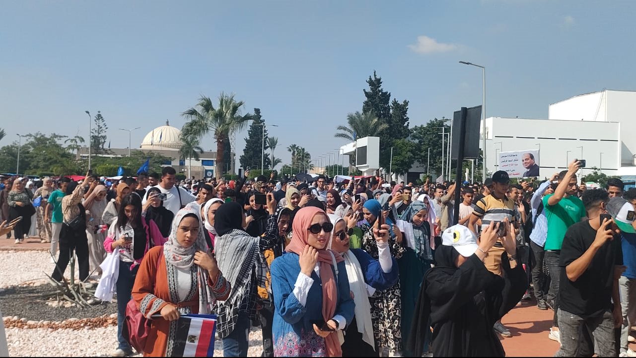 نظم الآلاف من طلاب جامعة أسيوط مسيرة حاشدة للتنديد بالعدوان الإسرائيلي على الشعب الفلسطيني داعمين تصريحات الرئيس عبد الفتاح السيسي اليوم حول رفض تهجير الفلسطينيين لسيناء ودعم القضية الفلسطينية.