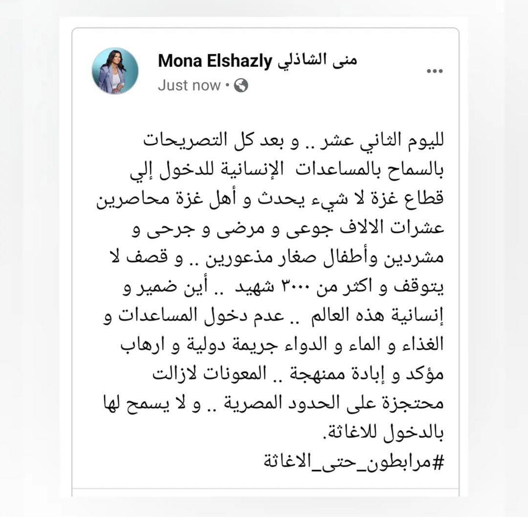 وكتبت الشاذلي عبر حسابها على فيس بوك: "لليوم الثاني عشر، وبعد كل التصريحات بالسماح بالمساعدات الإنسانية للدخول إلى قطاع غزة، لا شيء يحدث، وأهل غزة محاصرون".
