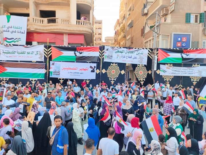 وشارك المئات من أبناء محافظة المنوفية في مظاهرة حاشدة بشارع الاستاد بمدينة شبين الكوم برفع أعلام مصر وفلسطين وترديد هتافات مناهضة للجيش الإسرائيلي.