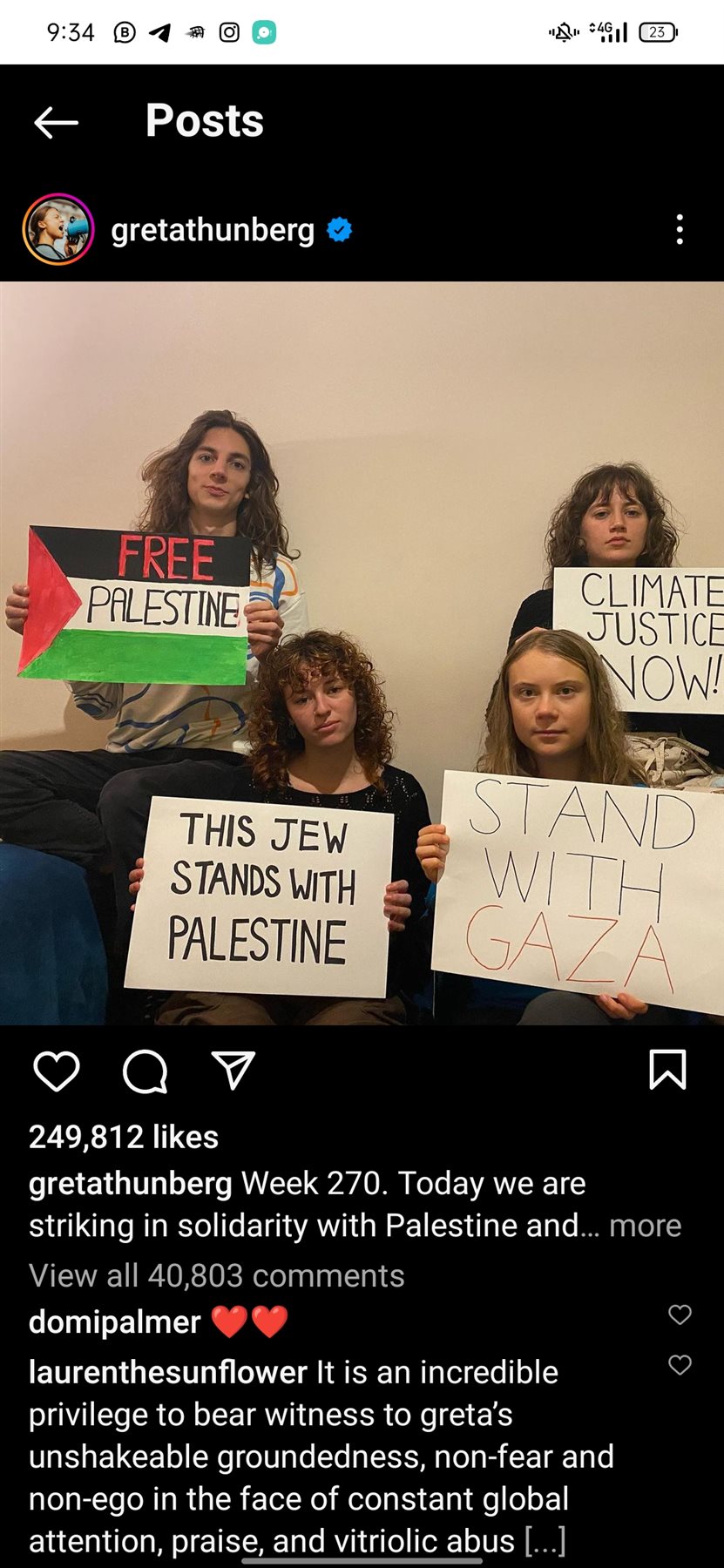 وانتشر منشور جريتا، التي يتابعها قرابة 15 مليون شخص على إنستجرام فقط، حول العالم داعمين لها بعد إعلانها رفضها المذبحة الغير مسبوقة التي ترتكبها قوات الاحتلال الإسرائيلي ضد سكان قطاع غزة.