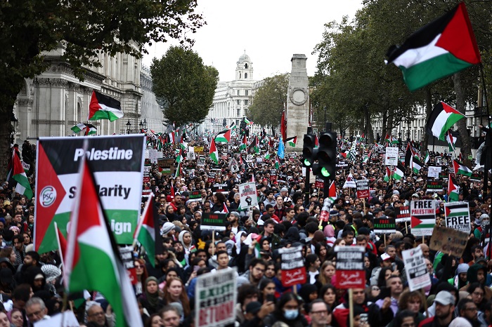 قام عشرات الآلاف من البريطانيين، مساء اليوم السبت، بالتظاهر في العاصمة لندن، تضامنًا مع الشعب الفلسطيني، وتنديدا بالعدوان الإسرائيلي المتواصل على قطاع غزة.