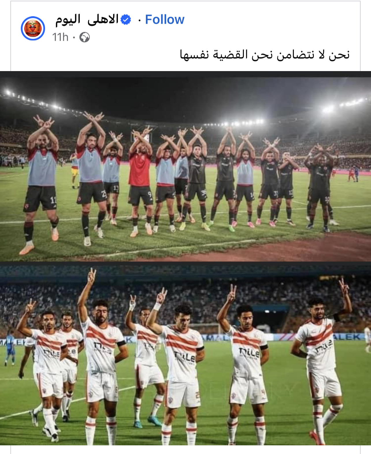 وشهد رواد السوشيال ميديا وحدة بين الصفحات الرسمية لمشجعي نادي الأهلي والزمالك، فقامت صفحات مشجعي نادي الأهلي بنشر صورة للاعبي نادي الزمالك وهم يقومون برفع ايديهم والإشارة بعلامة "النصر"، لإظهار تضامنهم مع شعب فلسطين، من مباراة الزمالك الأخيرة.