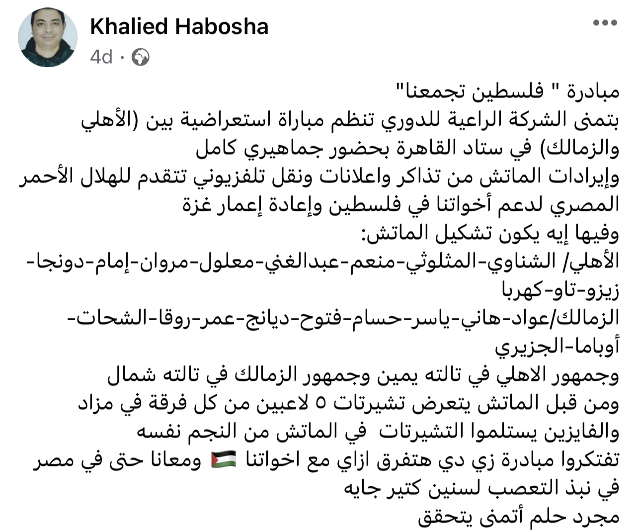- مبادرة " فلسطين تجمعنا" بتمنى الشركة الراعية للدوري تنظم مباراة استعراضية بين (الأهلي والزمالك) في ستاد القاهرة بحضور جماهيري كامل وإيرادات الماتش من تذاكر واعلانات ونقل تلفزيوني تتقدم للهلال الأحمر المصري لدعم أخواتنا في فلسطين وإعادة إعمار غزة.