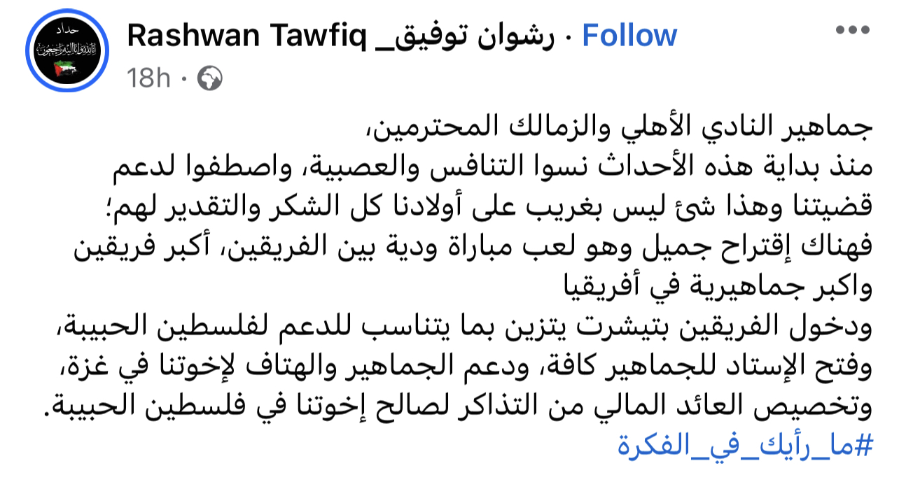 فلسطين توحد قطبي الكرة المصرية.. طالب عدد من جماهير الكرة المصرية بإقامة مباراة بين ناديي الأهلي والزمالك، لتخصيص عائد المباراة لدعم الشعب الفلسطيني جراء الحرب من جيش الاحتلال الاسرائيلي.