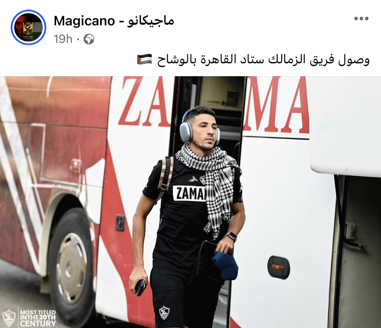 كما نشرت صفحات مشجعي النادي الأهلي، صورة وصول نادي الزمالك إلي مباراة أمس، وهم يضعون وشاح فلسطين، وعلقوا عليها كاتبين: "نحن لا نتضامن نحن القضية نفسها".