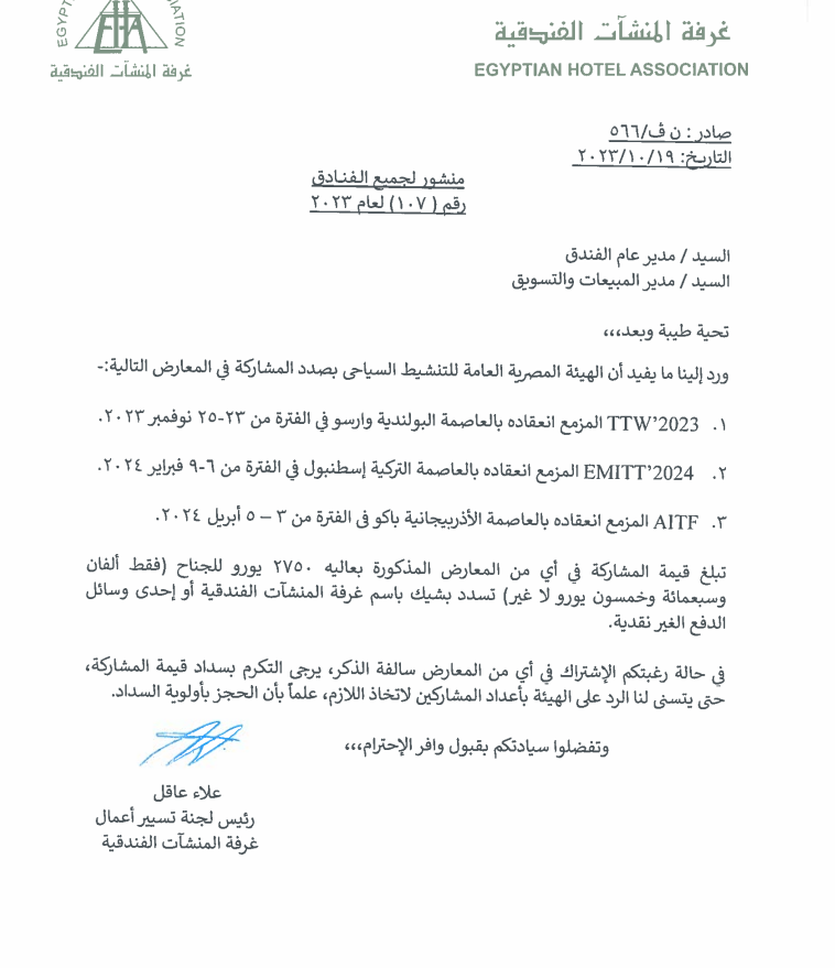 وأخطرت هيئة تنشيط السياحة ، غرفة المنشآت الفندقية أنها بصدد المشاركة في 3 معارض سياحية ببولندا و تركيا و أذرييجان ، لاتاحة الفرصة أمام الراغبين من المنشآت الفندقية للمشاركة بهذه المعارض.