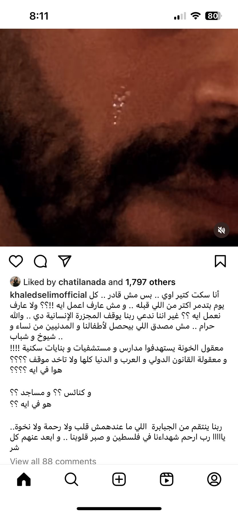 وظهر فيه يبكي على الأحداث في غزة، وكتب: “سكت كتير اوي بس مش قادر كل يوم بتدمر اكتر من اللي قبله.. ربنا ينتقم من الجبابرة اللي معندهمش قلب”.