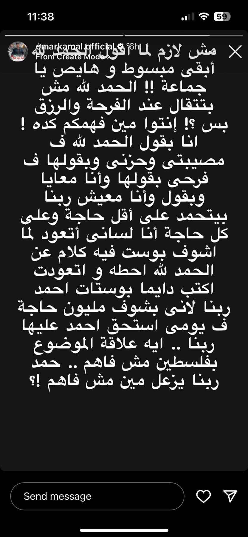 وكان عمر كمال نشر ستوري تعرض بعدها لهجوم، بسبب تجاهل أوضاع غزة، ورد عليها على الفور ليوضح موقفه.