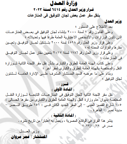 قرر وزير العدل المستشار عمر مروان، نقل مقر اللجنة الثانية للجان التوفيق في المنازعات، التابعة لوزارة النقل والمختصة بالهيئة العامة للطرق والكباري من مقرها الحالي بقصر العيني للمقر الجديد بشارع النصر بمدينة نصر.