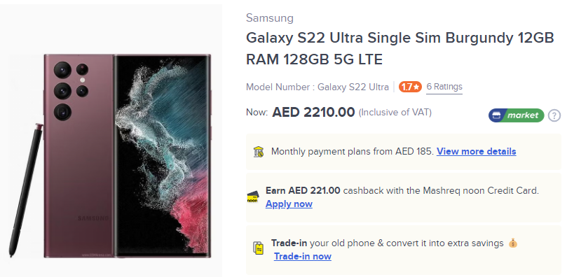 وصل بلغ سعر جوال Samsung Galaxy S22 Ultra 5G فى الإمارات لسعة 128 جيجابايت 2210 درهماً إماراتياً مايعادل 18,600 جنيهاً مصرياً، أى أنه أقل من سعره فى الأسواق بحوالى 15 ألف جنيه.