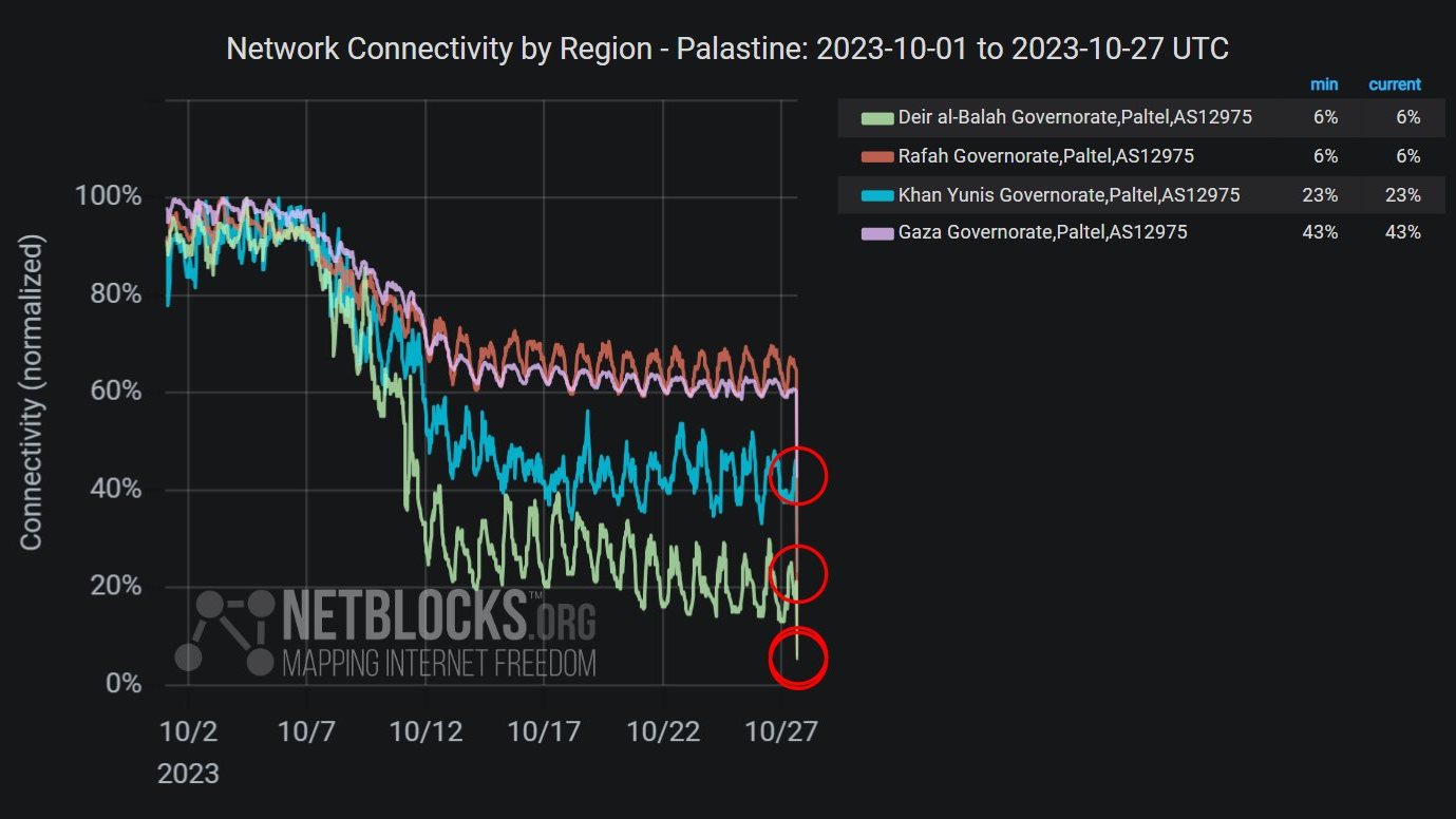 وفي وقت سابق، أكدت حركة حماس أن قطع الاتصالات والإنترنت عن قطاع غزة وتصعيد القصف براً وبحراً وجواً على الأحياء السكنية يُنذِر بِنِيَّة الاحتلال ارتكاب مزيدٍ من المجازر وجرائم الإبادة بعيداً عن أعين الصحافة والعالم.