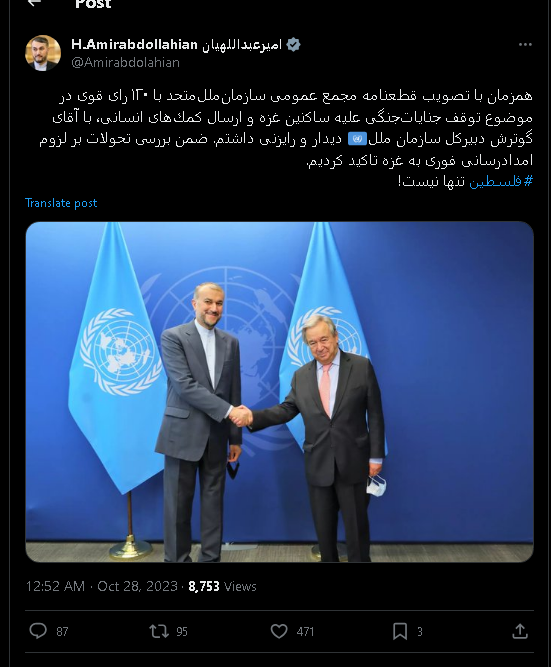 ونشر عبد اللهيان تغريدة عبر حسابه على موقع "إكس"، قال فيها إنه التقى الأمين العام للأمم المتحدة أنطونيو جوتيريش، وبحث معه مشروع القرار العربي بشأن قطاع غزة، والذي وافقت عليه الأمم المتحدة، وطالبت بـ"هدنة إنسانية فورية" في غزة ووصول المساعدات الإنسانية وحماية المدنيين في القطاع المحاصر.