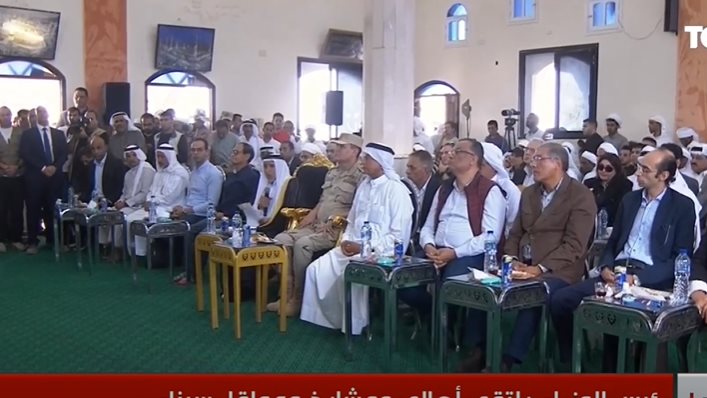 وأكد أن التنمية السياحية، في سيناء تشمل إنشاء قرى سياحية ومارينا لليخوت غرب العريش، وإنشاء قرى سياحية وترفيهية ومارينا لليخوت من الشيخ زويد حتى رفح، وإحياء مسار العائلة المقدسة بمنطقة القرما، وتطوير كورنيش مدينة العريش والمدخل، مشددا على عدم السماح بالمساس بأرض سيناء، قائلا: محدش هيقدر يقرب من سيناء، وكل ذرة رمل في سيناء ملايين المصريين مستعدين لبذل الأرواح لحمايتها حتى لا يقترب منها أحد، مؤكدا: لن نسمح بحل قضايا إقليمية على حساب مصر.