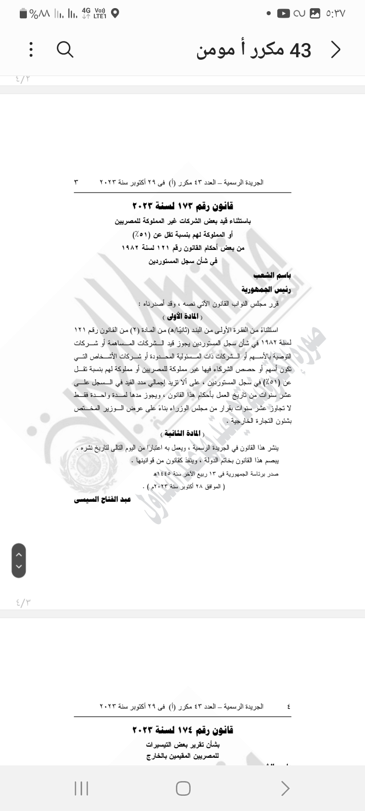 نشرت الجريدة الرسمية، قرار الرئيس عبد الفتاح السيسى، رقم 173 لسنة 2023 باستثناء قيد بعض الشركات غير المملوكة للمصريين أو المملوكة لهم بنسبة تقل عن 51٪ من بعض أحكام القانون رقم 121 لسنة 1982 في شأن سجل المستوردين، والذى وافق عليه مجلس النواب.