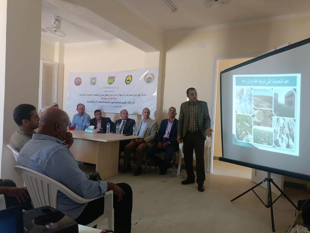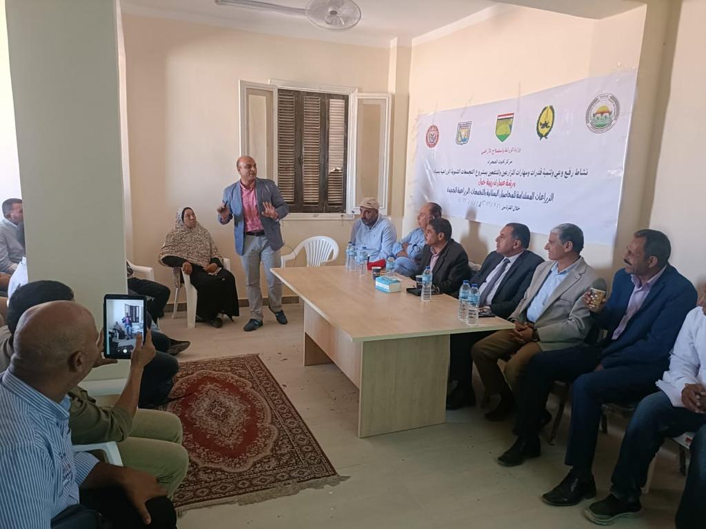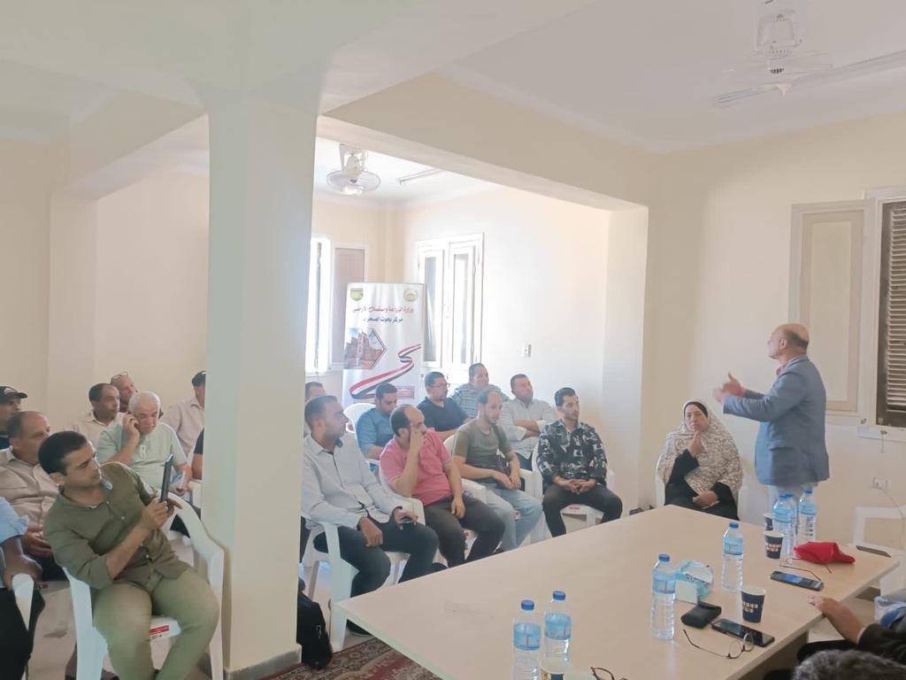 نظم مركز بحوث الصحراء ورشة عمل مجتمعية بتجمع بغداد بمدينة الحسنة محافظة شمال سيناء لتدريب المنتفعين والمزارعين من أبناء سيناء والوادي علي كيفية الإدارة المثلي لأراضي التجمعات الزراعية بسيناء.