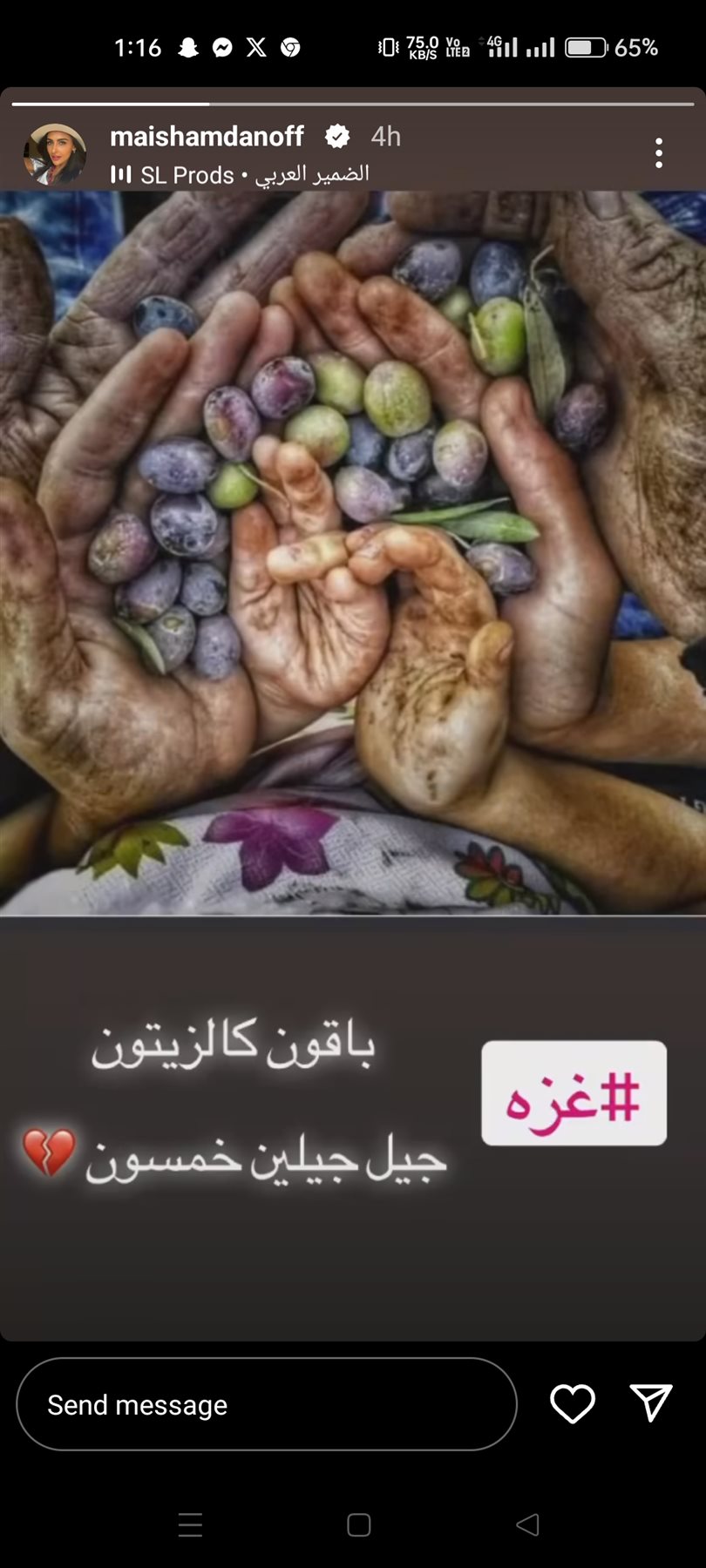 شاركت الفنانة ميس حمدان حالة جديدة لها عبر صفحتها على موقع التواصل الاجتماعي لتبادل الصور والفيديوهات القصيرة إنستجرام خلال خاصية الاستوري لتدعيم القضية الفلسطينية.