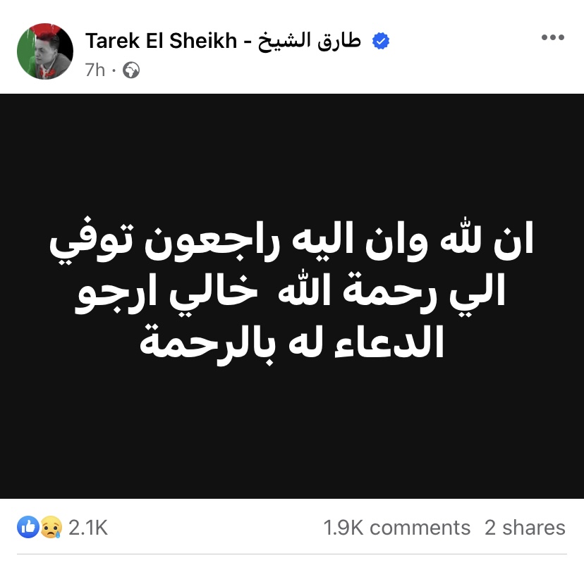 وكتب طارق الشيخ عبر صفحت الرسمية على فيسبوك:" إنا لله وإنا إليه راجعون ، توفى إلى رحمة الله خالى ، ارجو الدعاء له بالرحمة".