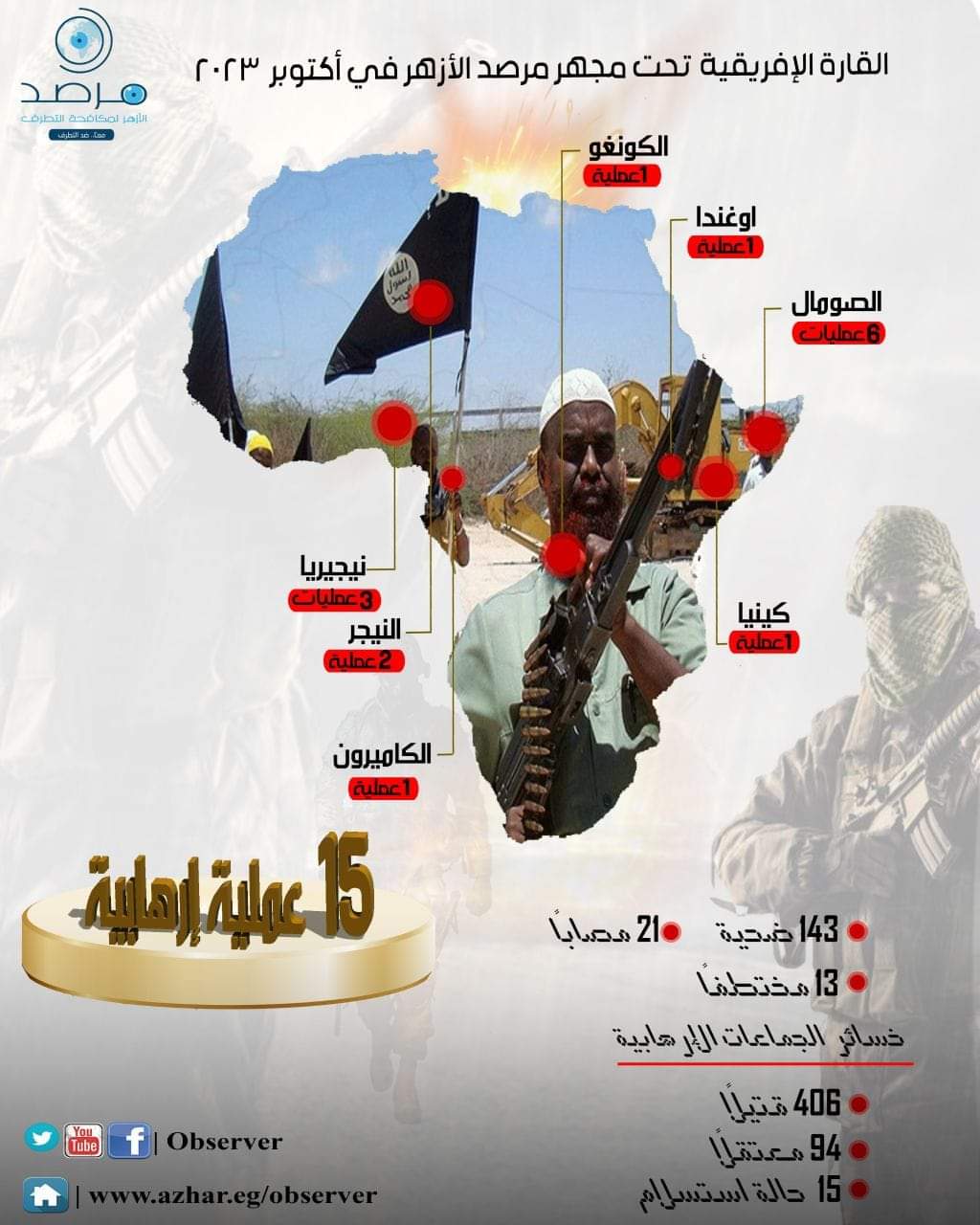 تابعت وحدة رصد باللغات الإفريقية على مدار شهر أكتوبر 2023م جرائم التنظيمات الإرهابية التي بلغ عدد عملياتها (15) عملية إرهابية أسفرت عن مقتل (143) شخصًا، وإصابة (21)، واختطاف (11) آخرين.