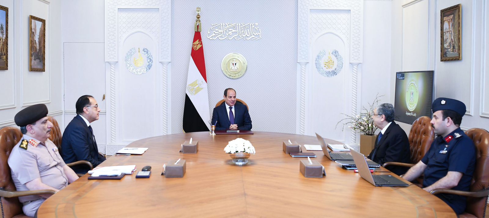 اجتمع الرئيس عبد الفتاح السيسي اليوم مع الدكتور مصطفى مدبولي، رئيس مجلس الوزراء، والدكتور محمد شاكر، وزير الكهرباء والطاقة المتجددة، والفريق أحمد الشاذلي، رئيس هيئة الشئون المالية للقوات المسلحة، والعقيد دكتور بهاء الغنام، المدير التنفيذي لجهاز مستقبل مصر للتنمية المستدامة.