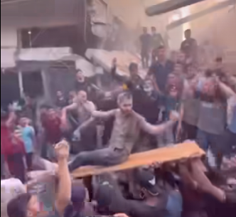 في لحظة تحمل فيها الألم والأمل معًا رغم الخراب والدمار المحيط بهم، ظهر شاب فلسطيني رمزًا للصمود والقوة بعد أن تمكن من النجاة من تحت أنقاض منزله المدمر في غزة ورقص بفرحة، رافعًا ذراعيه كأنه نسر يعلن نصره.