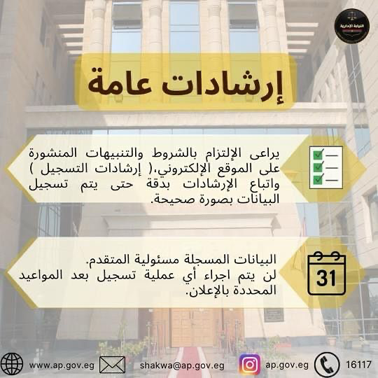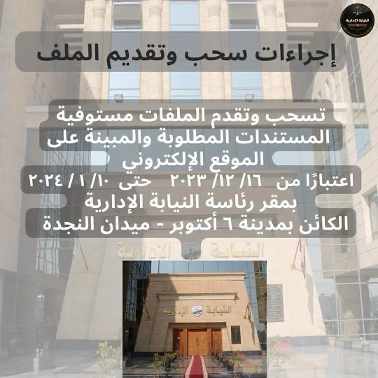 بدأت اليوم السبت الموافق ١١ / ١١ / ٢٠٢٣، إجراءات التسجيل بمسابقة تعيين معاون نيابة إدارية من خريجي دفعة ٢٠٢٣، من كليات الحقوق والشريعة والقانون وكلية الشرطة، والمقرر أن تستمر حتى يوم الجمعة الموافق ٢٤ / ١١ / ٢٠٢٣.