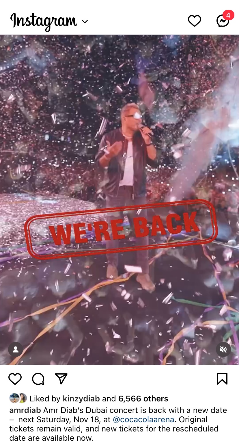 أعلن الفنان عمرو دياب عن عودته لإحياء حفل غنائى جديد بعد توقفه الفترة الماضية بسبب أحداث قصف غزة.