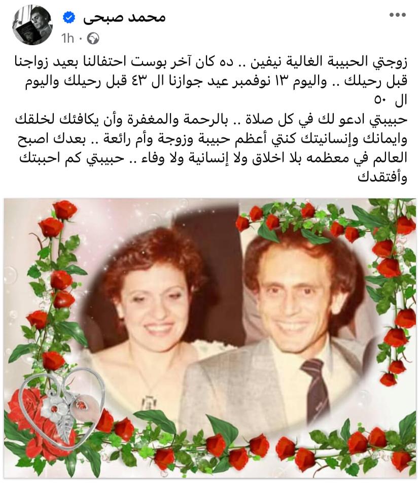 ونشر محمد صبحى صورة تجمعه بزوجته الراحلة وكتب :" زوجتي الحبيبة الغالية نيفين .. ده كان آخر بوست احتفالنا بعيد زواجنا قبل رحيلك .. واليوم ١٣ نوفمبر عيد جوازنا ال ٤٣ قبل رحيلك واليوم ال ٥٠ حبيبتي ادعو لك في كل صلاة .. بالرحمة والمغفرة وأن يكافئك لخلقك وايمانك وإنسانيتك كنتي أعظم حبيبة وزوجة وأم رائعة .. بعدك اصبح العالم في معظمه بلا اخلاق ولا إنسانية ولا وفاء .. حبيبتي كم احببتك وأفتقدك.