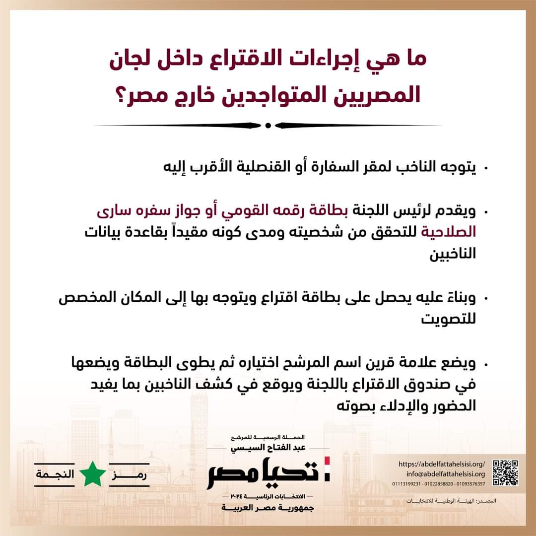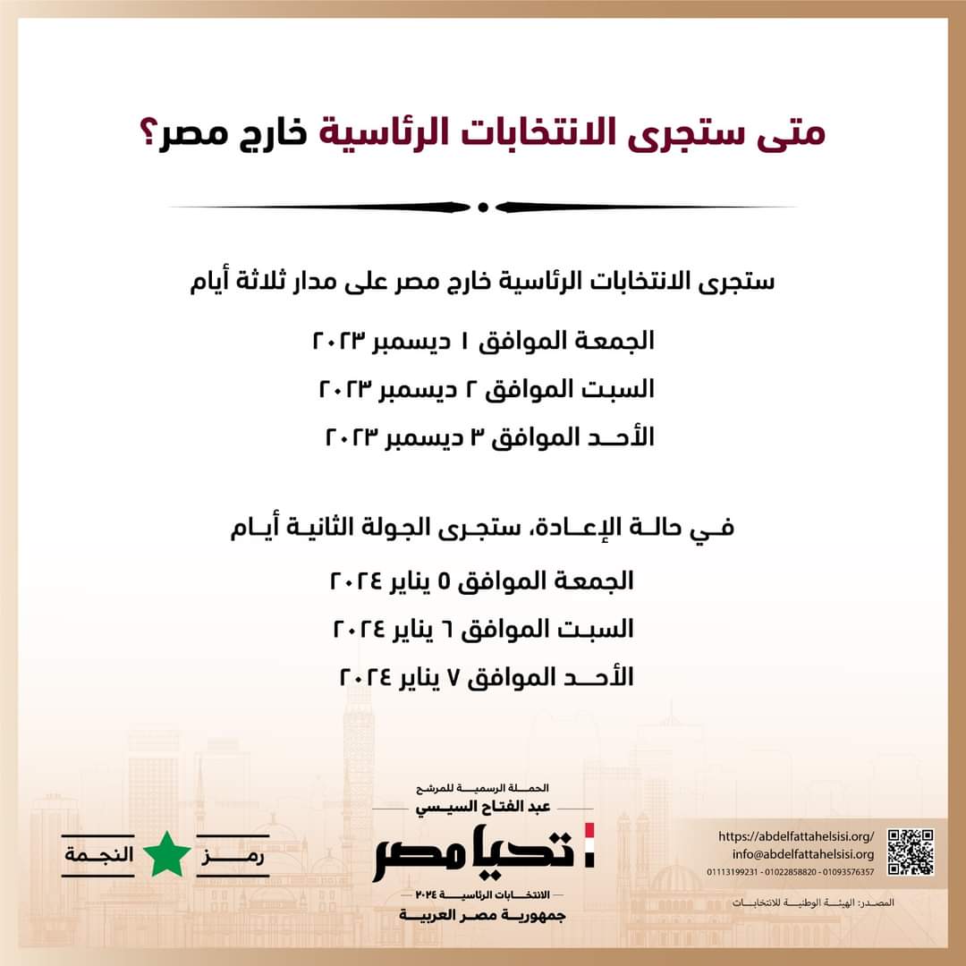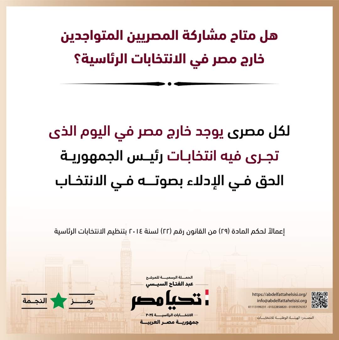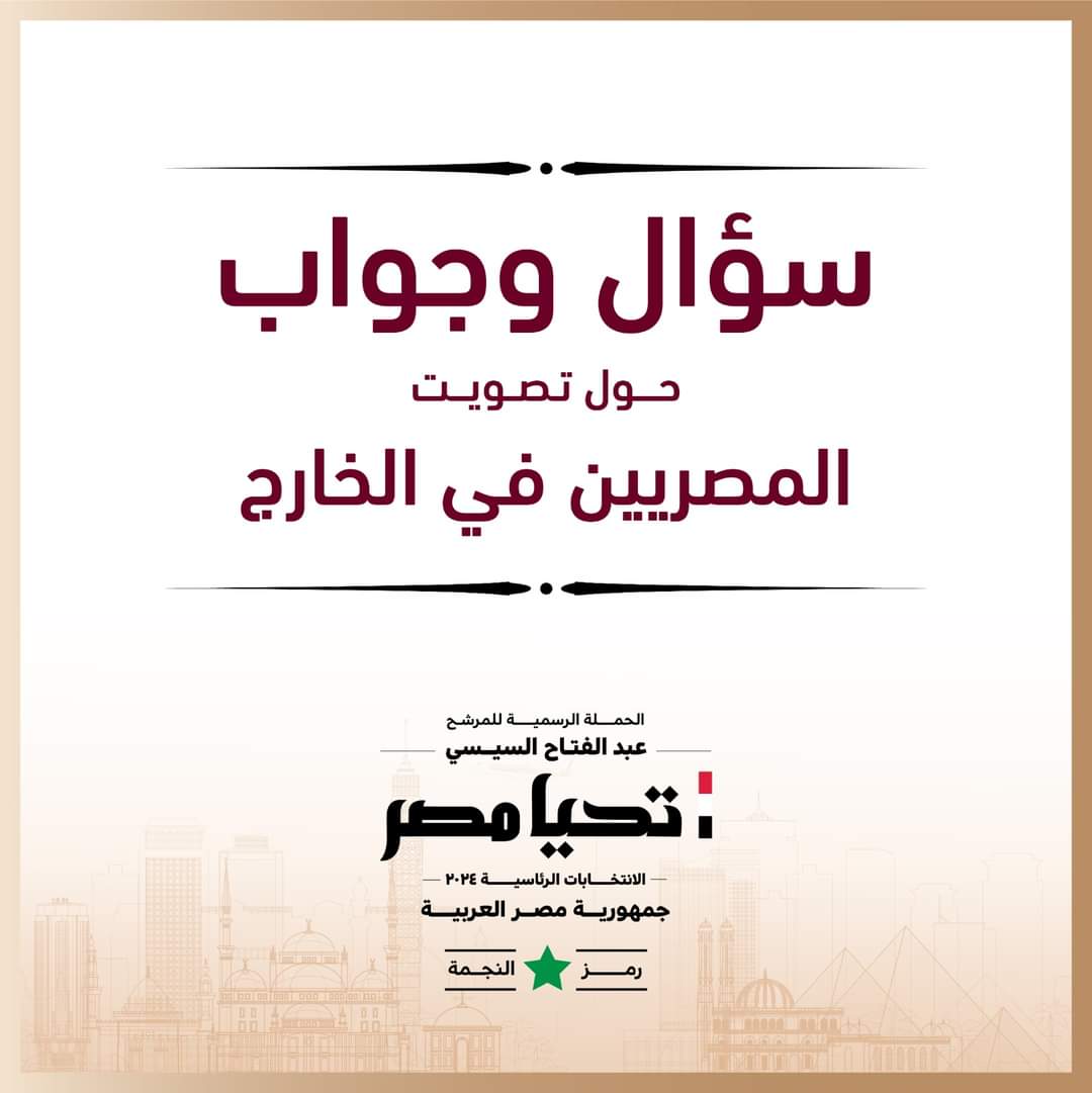 ومن جانبها قالت الحملة الرسمية للمرشح الرئاسي عبد الفتاح السيسي، إنه ومع قرب تصويت المصريين بالخارج للانتخابات الرئاسية 2024، يمكن التعرف على إجابات أبرز التساؤلات عن عملية تصويت المصريين في الخارج، فيما يلي: