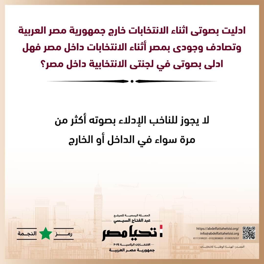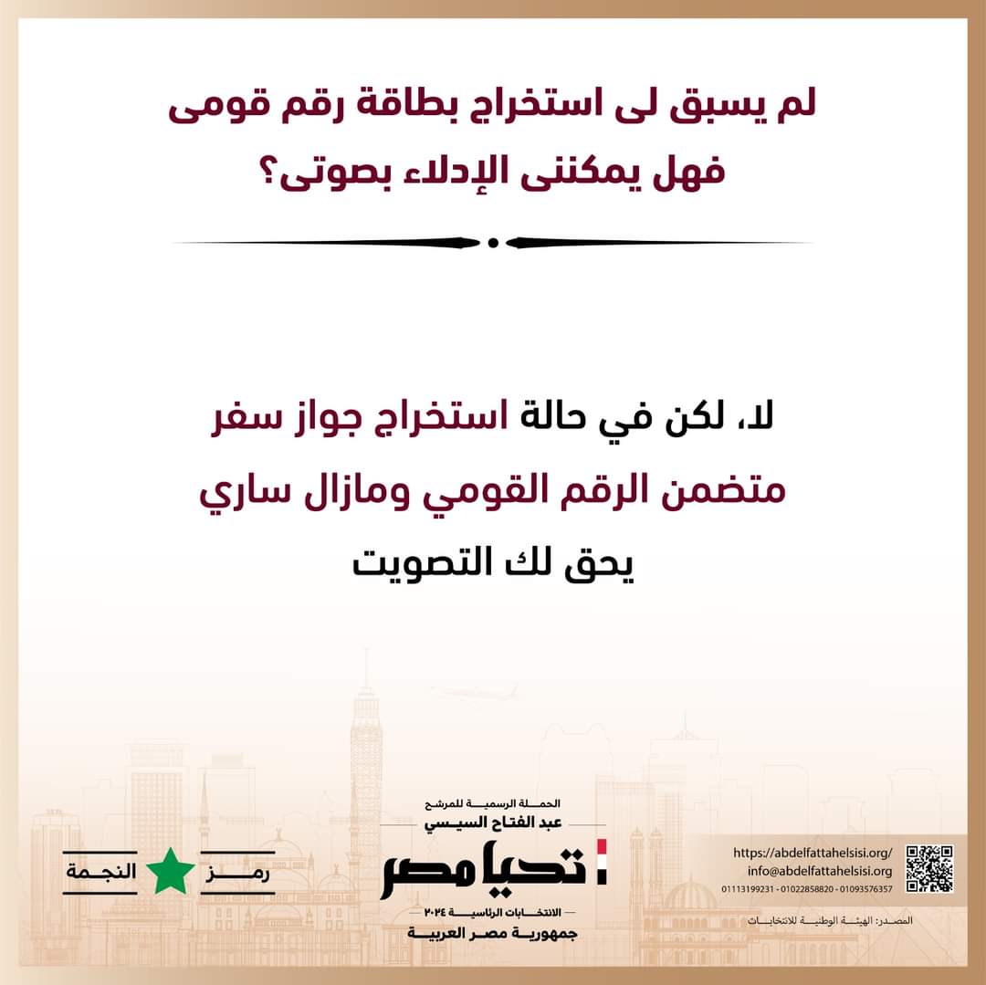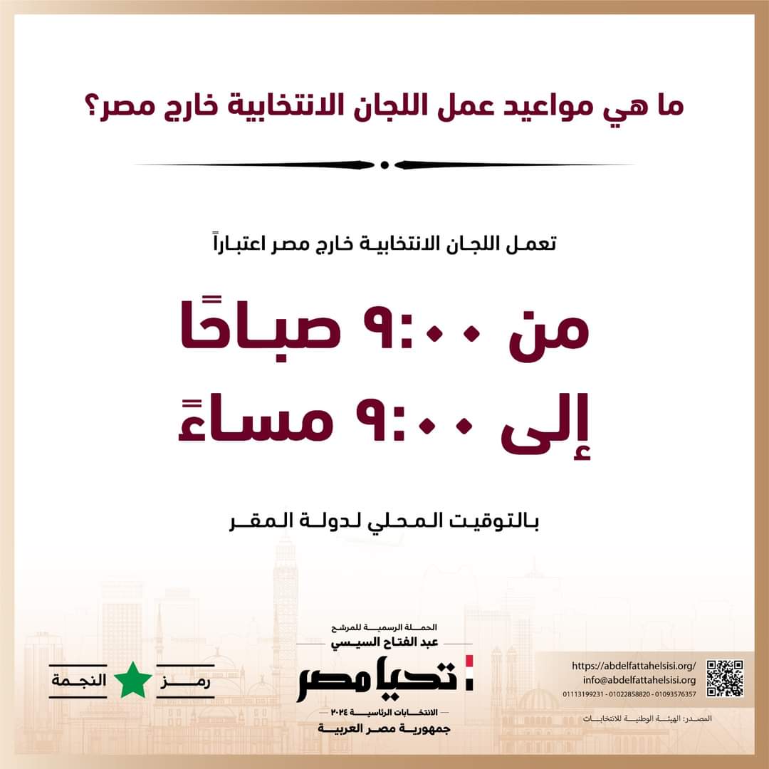 ومن جانبها قالت الحملة الرسمية للمرشح الرئاسي عبد الفتاح السيسي، إنه ومع قرب تصويت المصريين بالخارج للانتخابات الرئاسية 2024، يمكن التعرف على إجابات أبرز التساؤلات عن عملية تصويت المصريين في الخارج، فيما يلي: