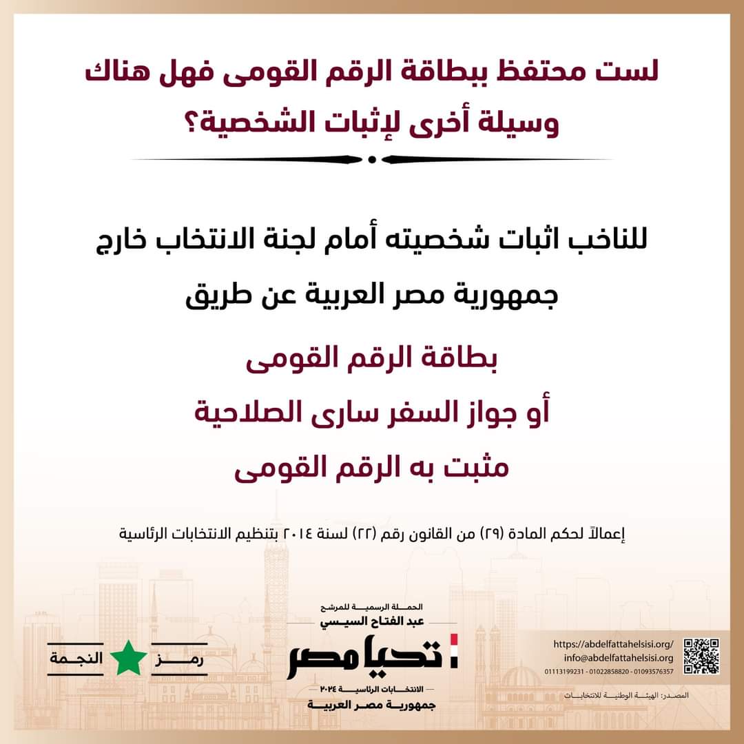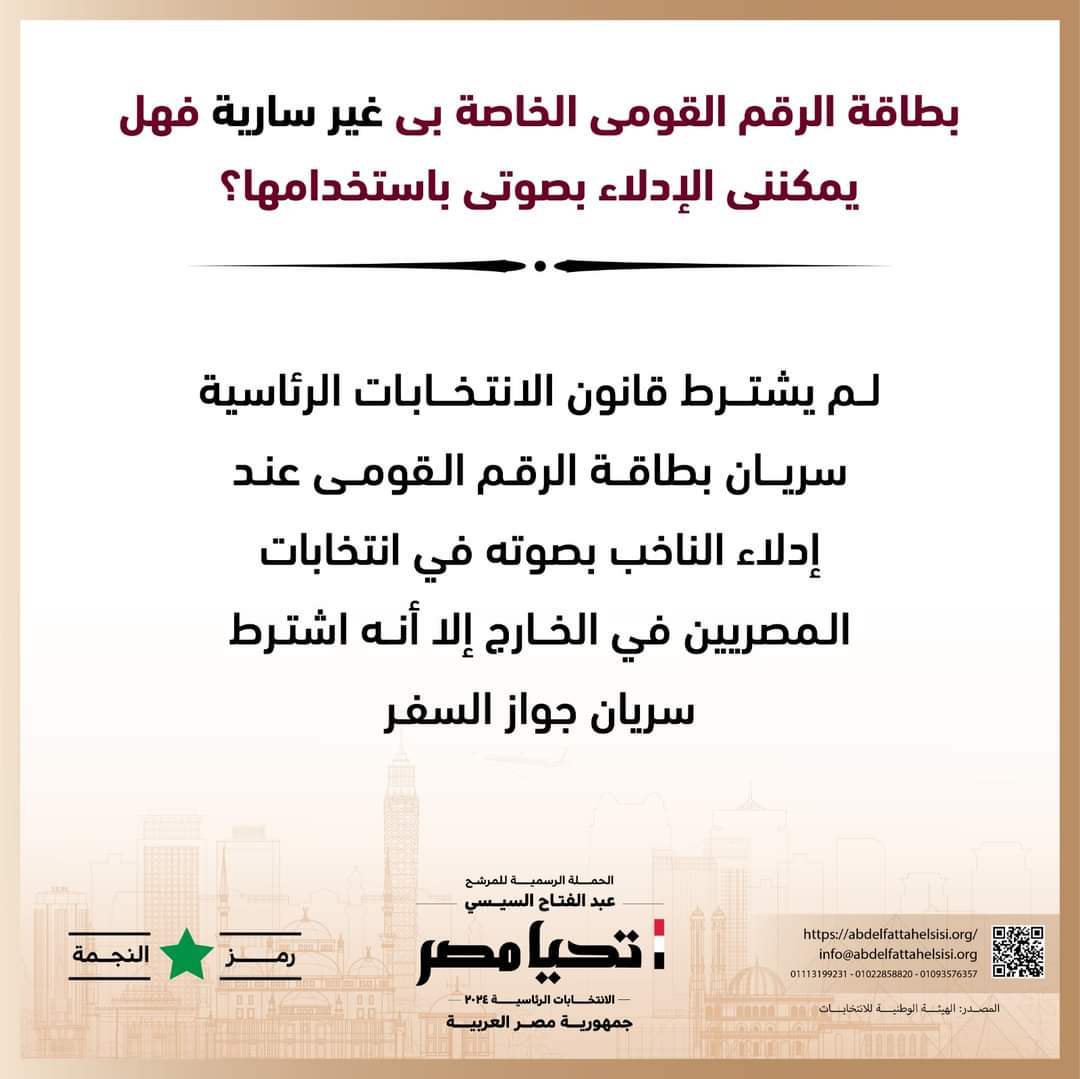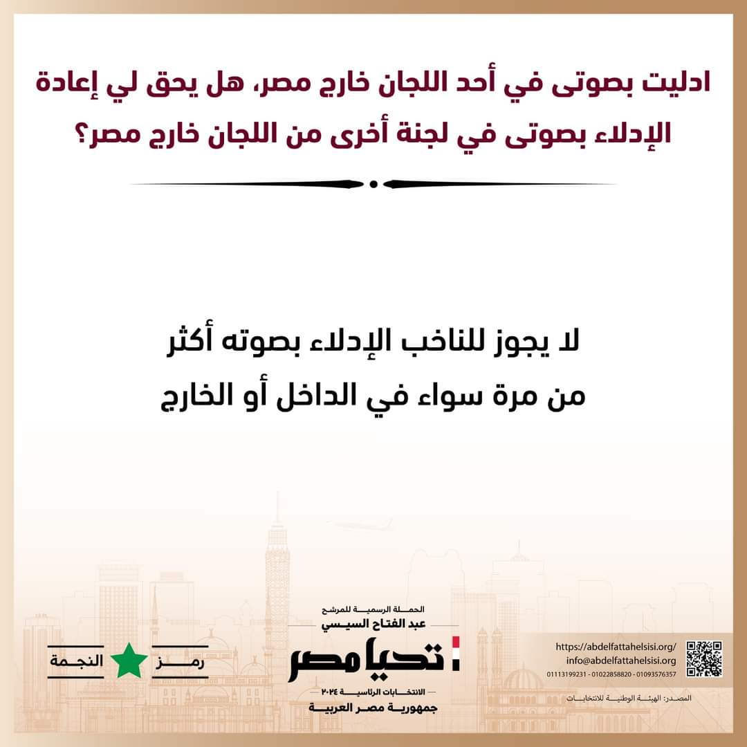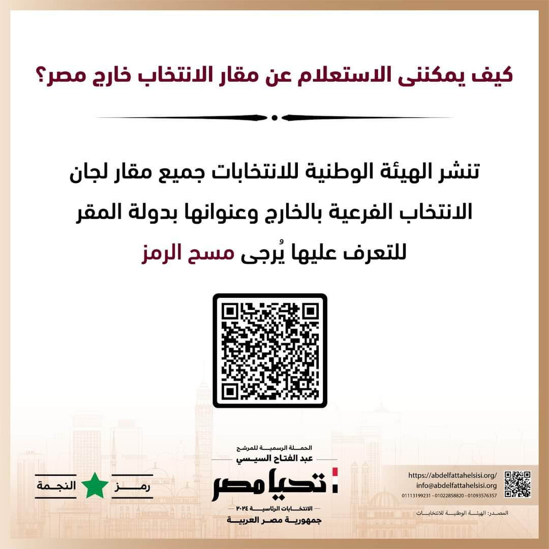 ومن جانبها قالت الحملة الرسمية للمرشح الرئاسي عبد الفتاح السيسي، إنه ومع قرب تصويت المصريين بالخارج للانتخابات الرئاسية 2024، يمكن التعرف على إجابات أبرز التساؤلات عن عملية تصويت المصريين في الخارج، فيما يلي: