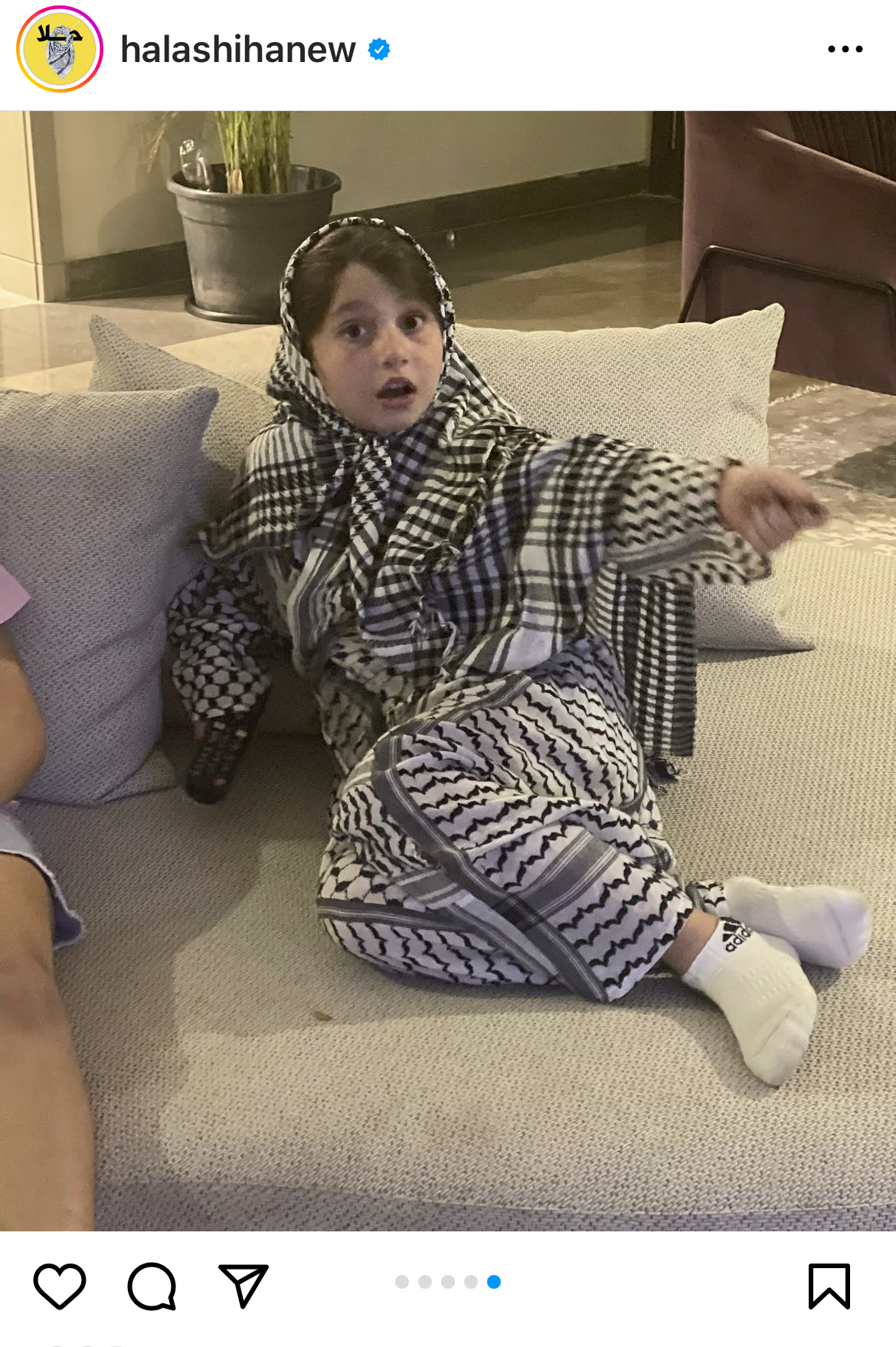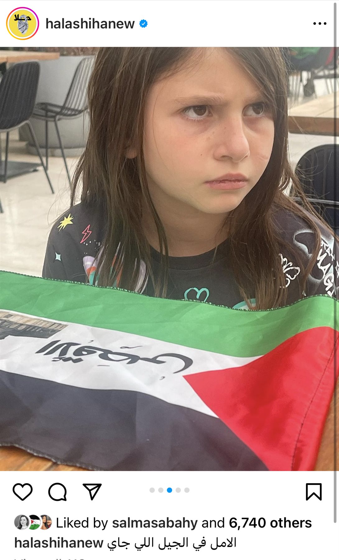 نشرت الفنانة حلا شيحة عبر صفحتها الرسمية عاي موقع الصور والفيديوهات الشهير إنستجرام صور لابنتها وهي ترتدي العلم والشال الفلسطيني.