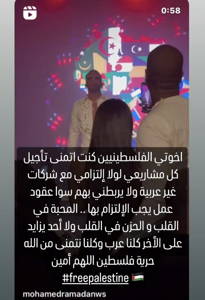 نشر الفنان محمد رمضان، فيديو من آخر حفلاته عبر حسابه بتطبيق إنستجرام، معلقا عليه "إخواتي الفلسطينيين، كنت أتمنى تأجيل كل مشاريعي، لولا إلتزامي مع شركات غير عربية، ولا يربطني بهم سوى عقود عمل، يجب الالتزام بها".